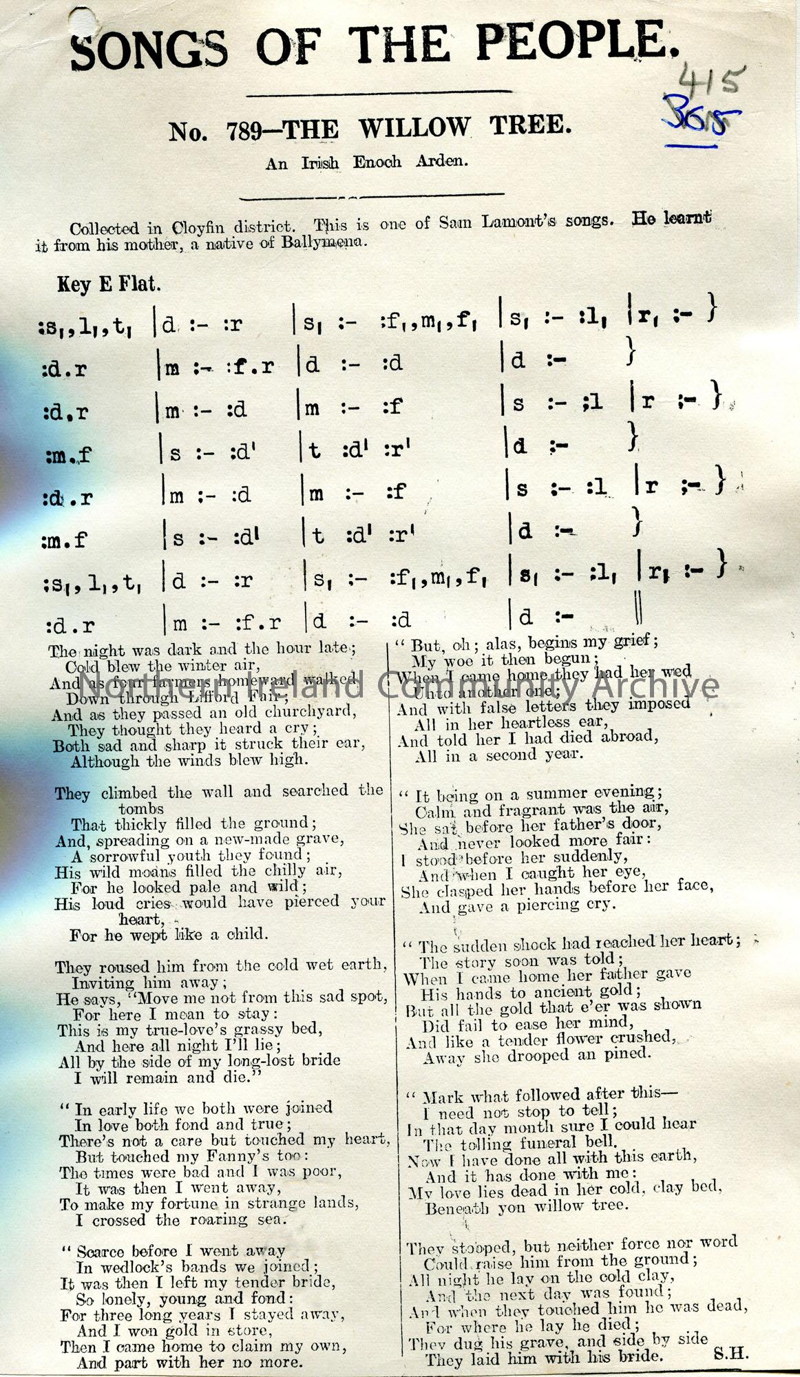 Songs of the People article of a tonic sol-fa notation and words to song titled, 'No. 789 - The Willow Tree'. An Irish Enoch Arden. Collected in Cloyfin district. This is one of Sam Lamont's songs. He learnt it from his mother, a native of Ballymena.