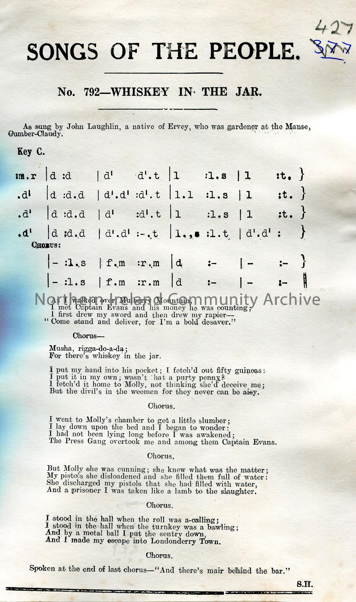 Songs of the People article of a tonic sol-fa notation and words to song titled, ‘No. 792 – Whiskey in the Jar’. As sung by John Laughlin, a native of…