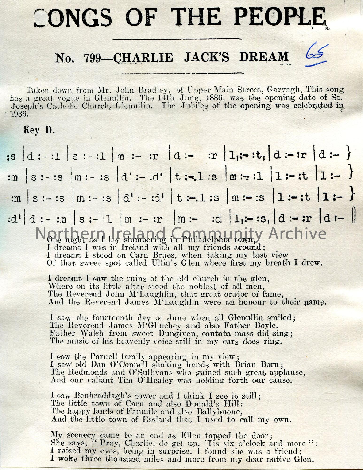 Songs of the People article of a tonic sol-fa notation and words to song titled, 'No. 799 - Charlie Jack's Dream'. 'Taken down from Mr John Bradley, Upper Main Street, Garvagh. This song has a great vogue in Glenullin.'