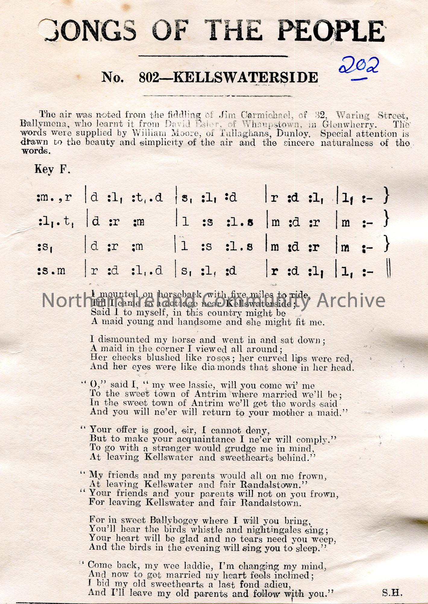 Songs of the People article of a tonic sol-fa notation and words to song titled, 'No. 802 - Kellswaterside'. Air noted from the fiddling of Jim Carmichael, 32 Waring Street, Ballymena, who learnt it from David Esler, of Whampstown, in Glenwherry. Words supplied by William Moore, of Tullaghans, Dunloy.