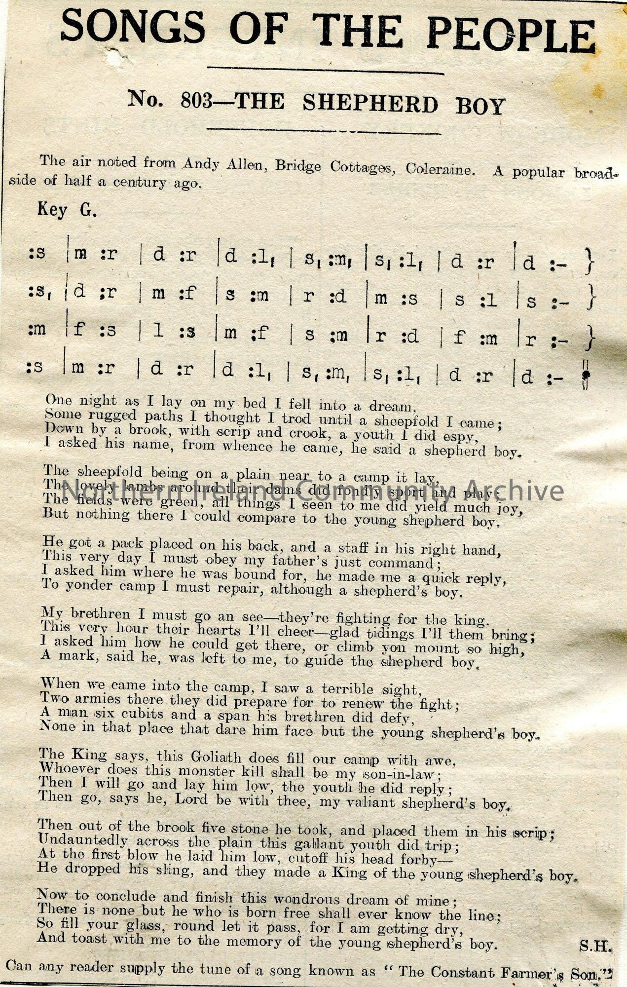 Songs of the People article of a tonic sol-fa notation and words to song titled, 'No. 803 - The Shepherd Boy'. Air noted from Andy Allen, Bridge Cottage, Coleraine. A popular broadside...