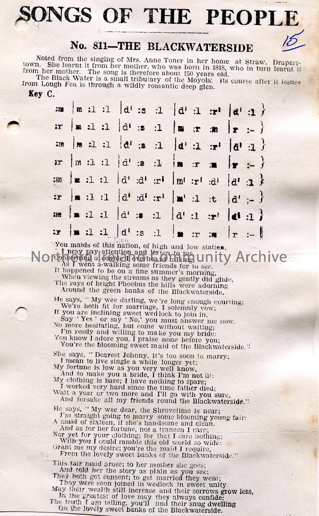 Songs of the People article of a tonic sol-fa notation and words to song titled, 'No. 811 - The Blackwaterside'. Noted from the singing of Mrs Anne Toner in her home at Straw, Draperstown. She learnt it from her mother, who was born in 1818, who in turn learnt it from her mother.