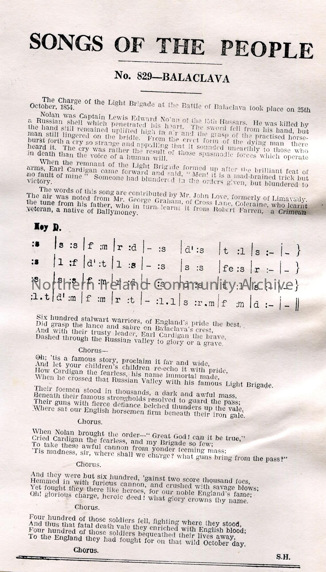 Songs of the People article of a tonic sol-fa notation and words to song titled, 'No. 829 - Balaclava'. Words supplied by John Love, formerly of Limavady. Air noted from Mr George Graham, of Cross Lane, Coleraine, who learnt the tune from his father, who in turn learnt it from Robert Farren, a Crimean veteran, a native of Ballymoney.