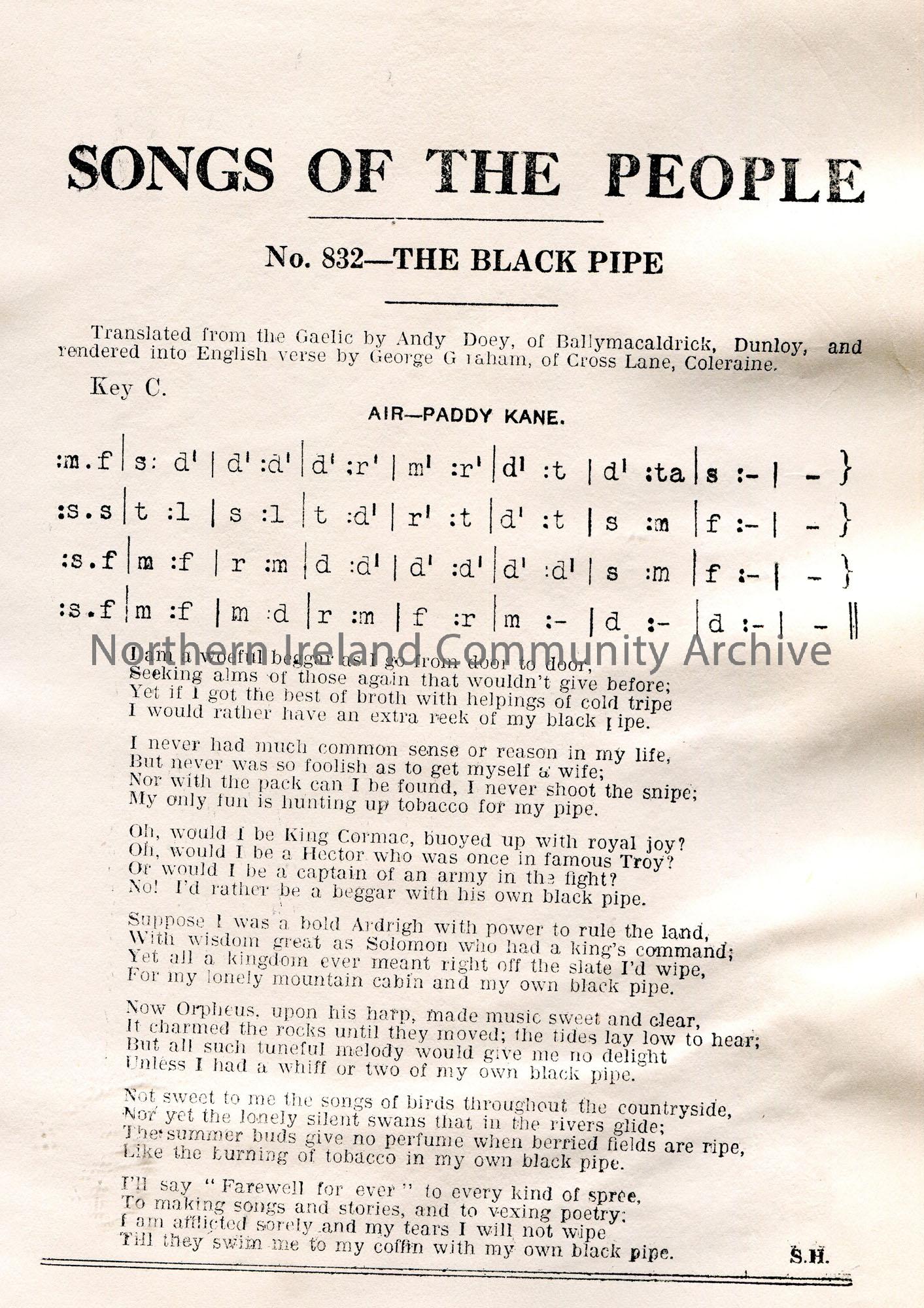 Songs of the People article of a tonic sol-fa notation and words to song titled, 'No. 832 - The Black Pipe'. Translated from the Gaelic by Andy Doey, Ballymacaldrick, Dunloy, and rendered into English verse by George Graham, Cross Lane, Coleraine.