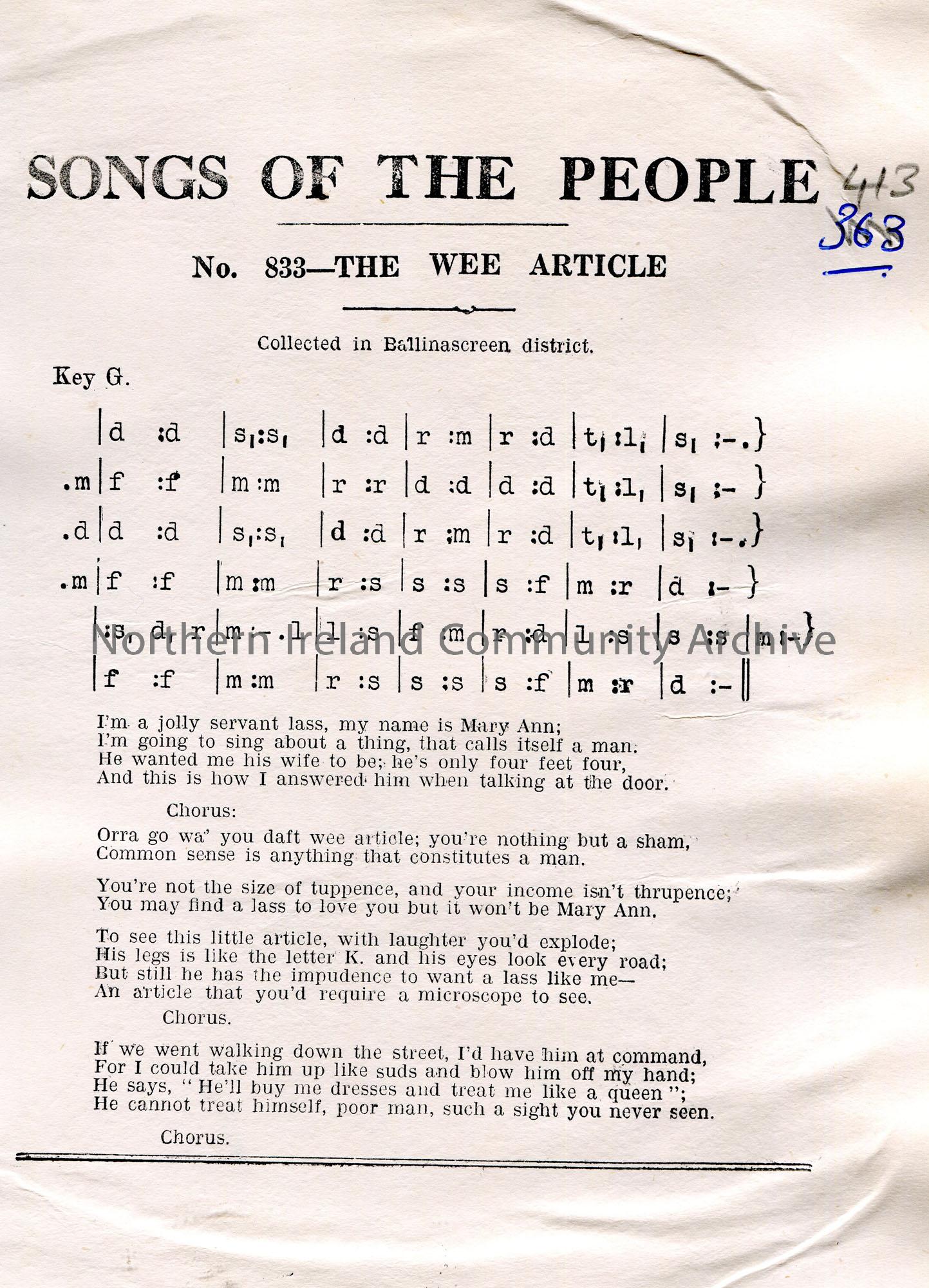 Songs of the People article of a tonic sol-fa notation and words to song titled, 'No. 833 - The Wee Article'. Collected in Ballinascreen district.