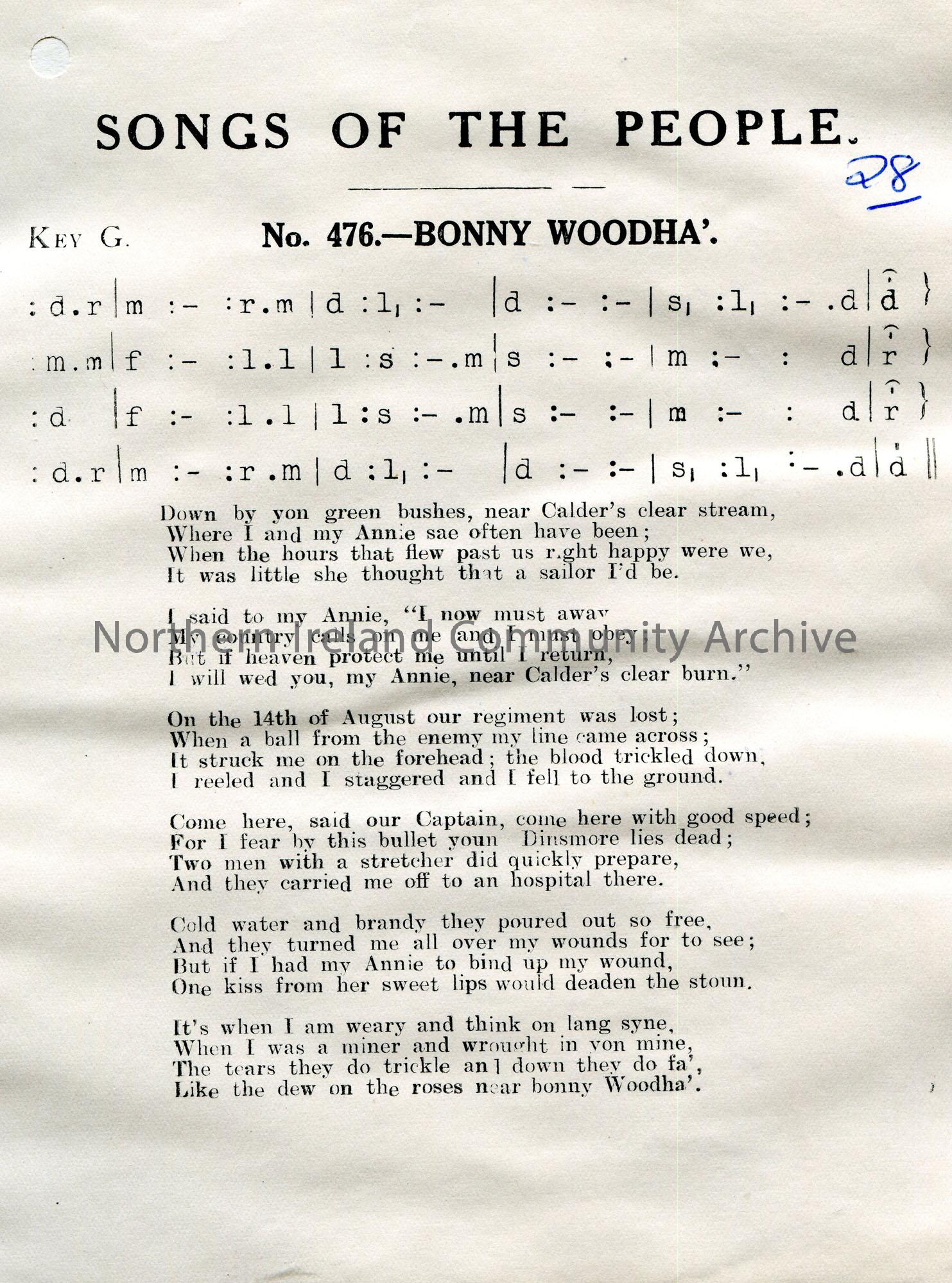 Songs of the People article of tonic sol-fa and words to song titled, ‘No. 476 – Bonny Woodha’.