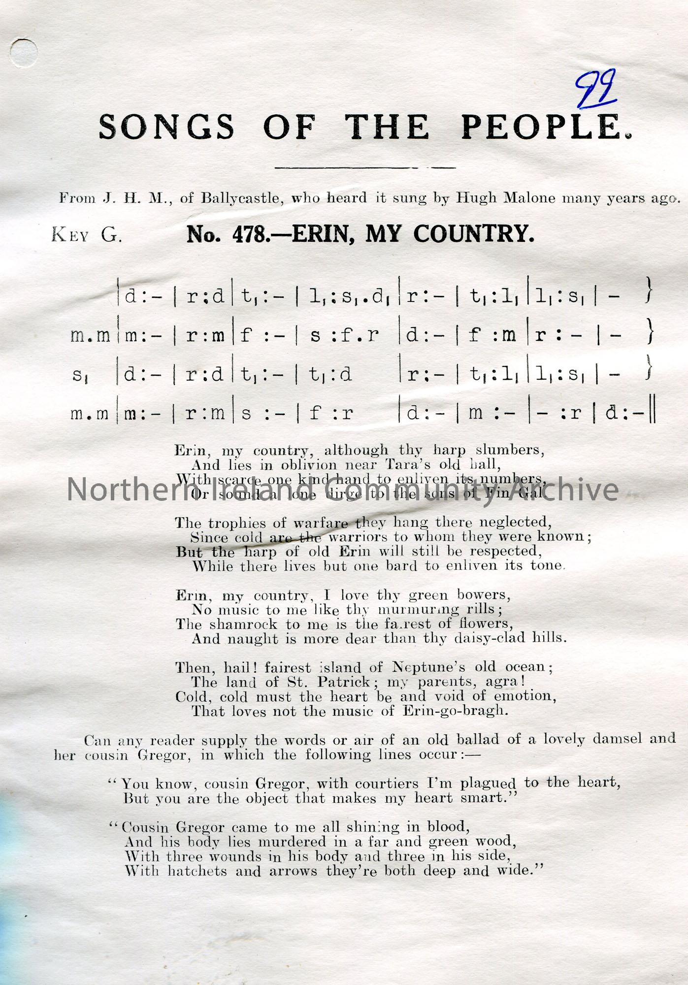 Songs of the People article of tonic sol-fa and words to song titled, 'No. 478 - Erin, My Country'. From J. H. M., [John Henry Macaulay] of Ballycastle, who heard it sung by Hugh Malone.