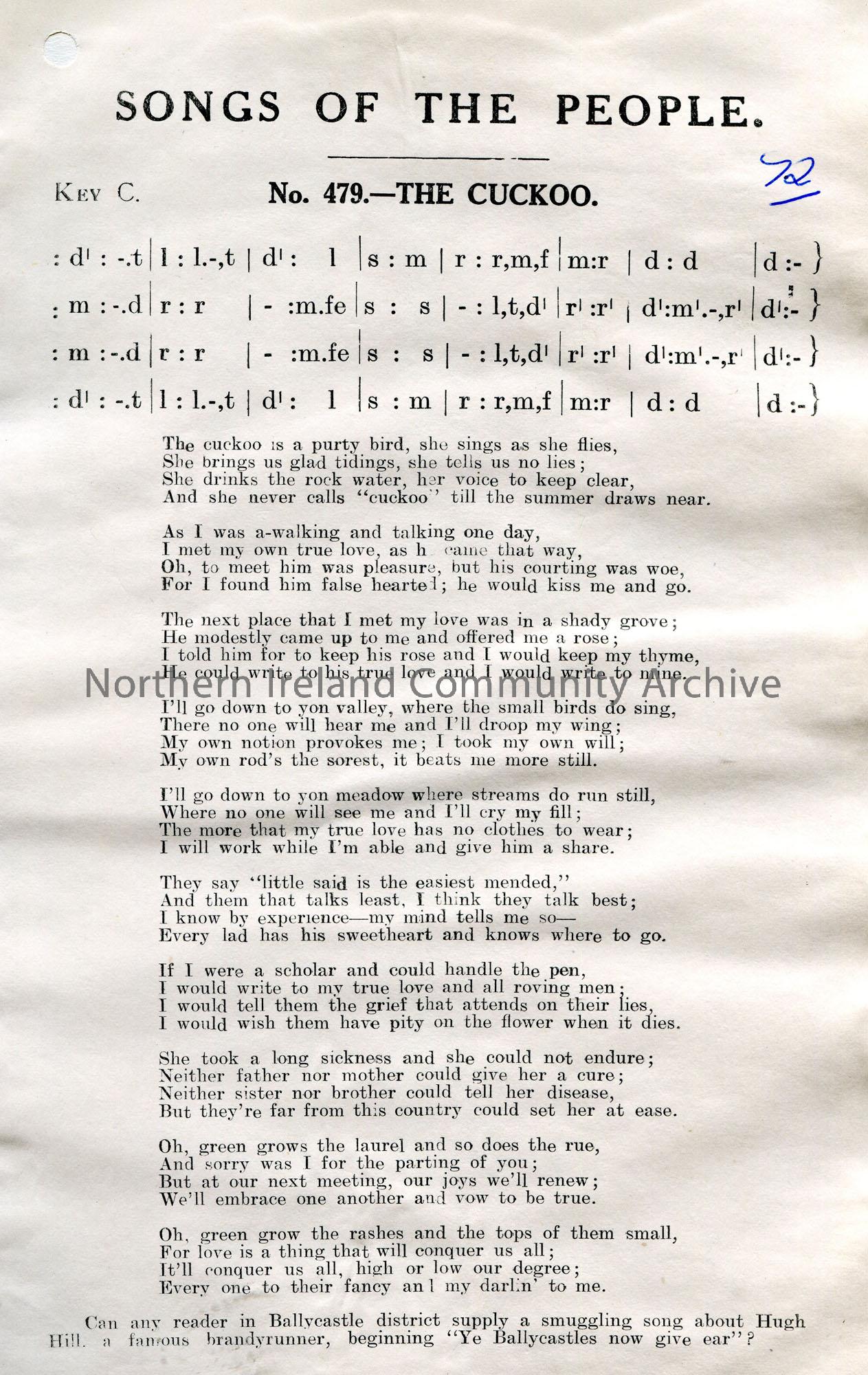 Songs of the People article of tonic sol-fa and words to song titled, 'No. 479 - The Cuckoo'.