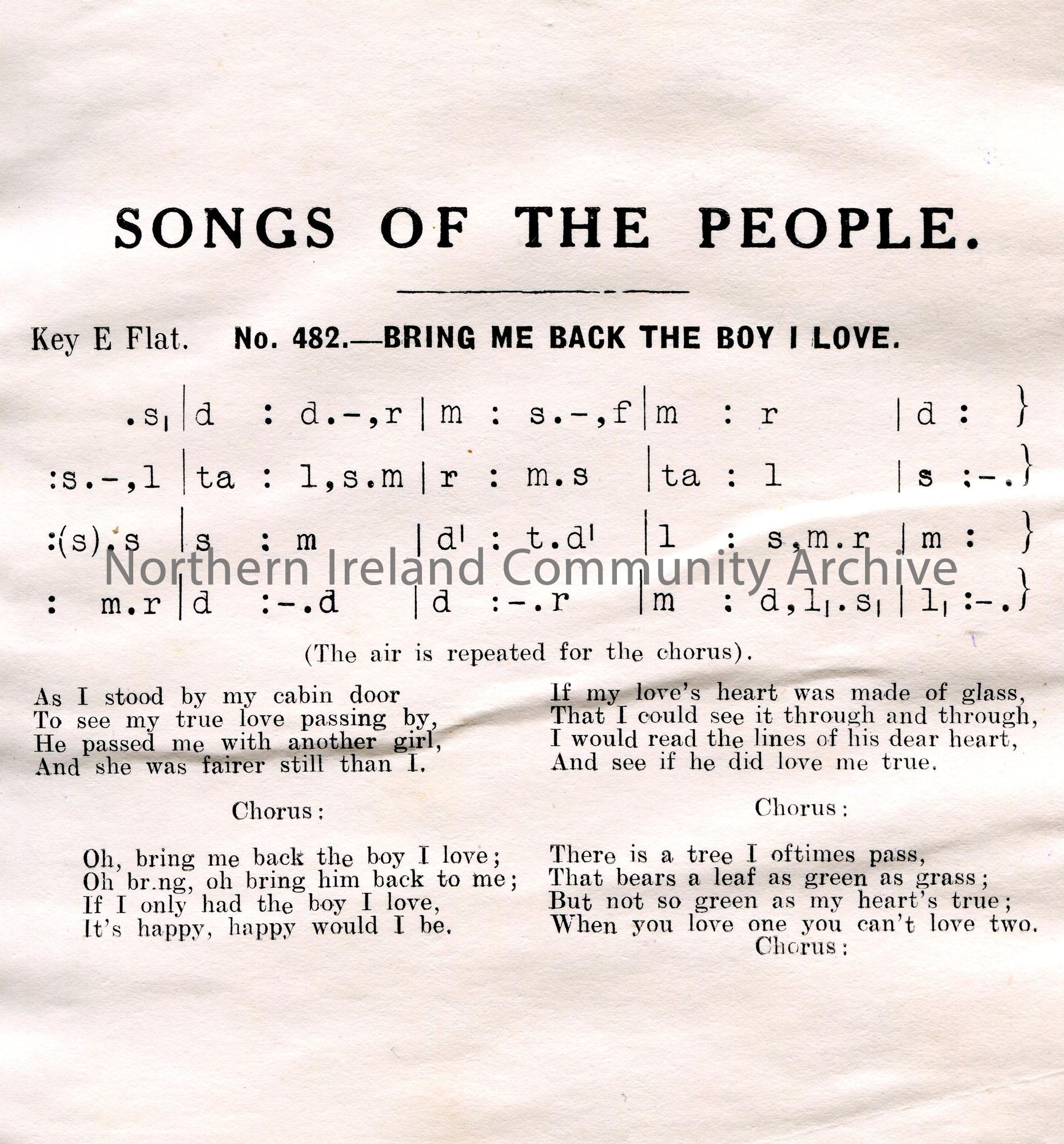 Songs of the People article of tonic sol-fa and words to song titled, ‘No. 482 – Bring Me Back the Boy I Love’.
