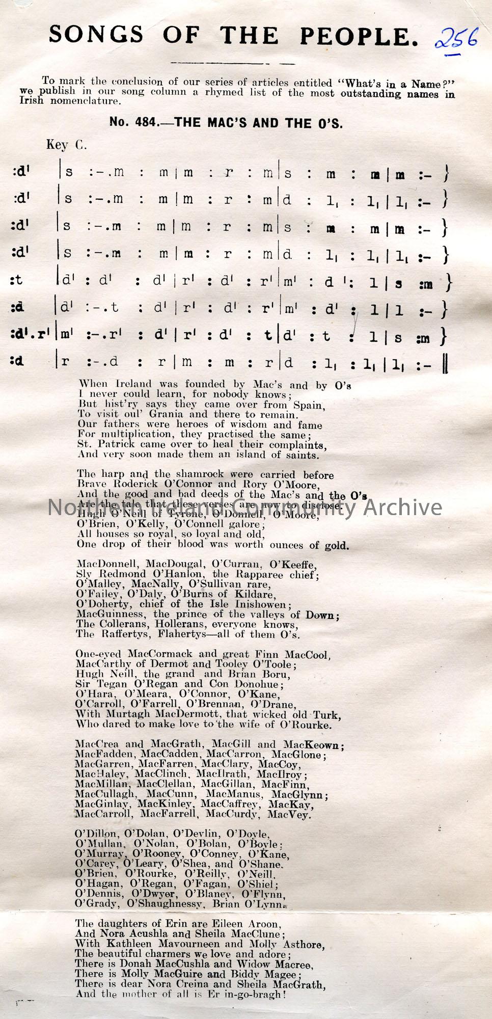 Songs of the People article of tonic sol-fa and words to song titled, ‘No. 484 – The Mac’s and the O’s’. Published to conclude a series of articles en…
