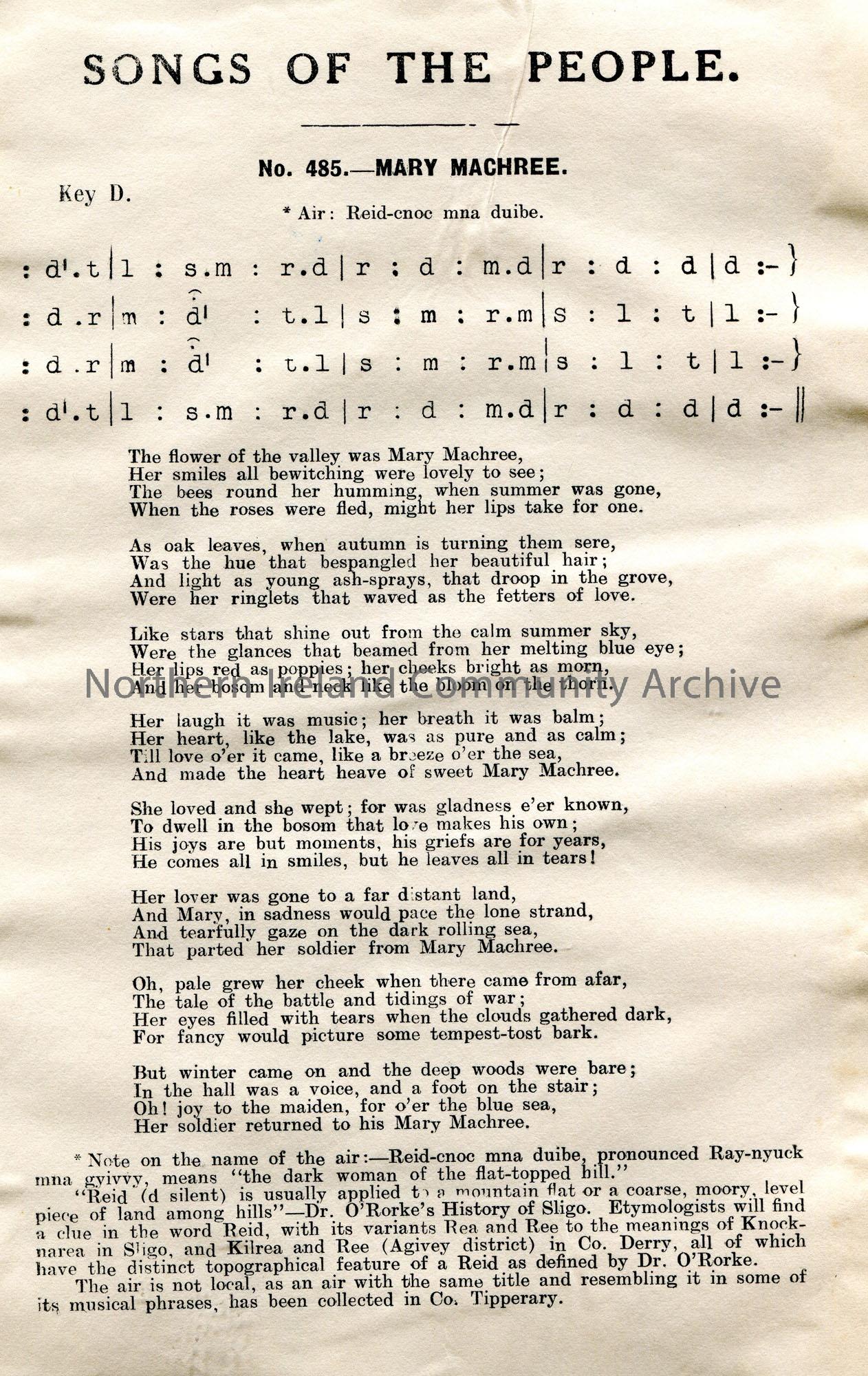 Songs of the People article of tonic sol-fa and words to song titled, ‘No. 485 – Mary Machree’. Air – Reid-cnoc mna duibe.