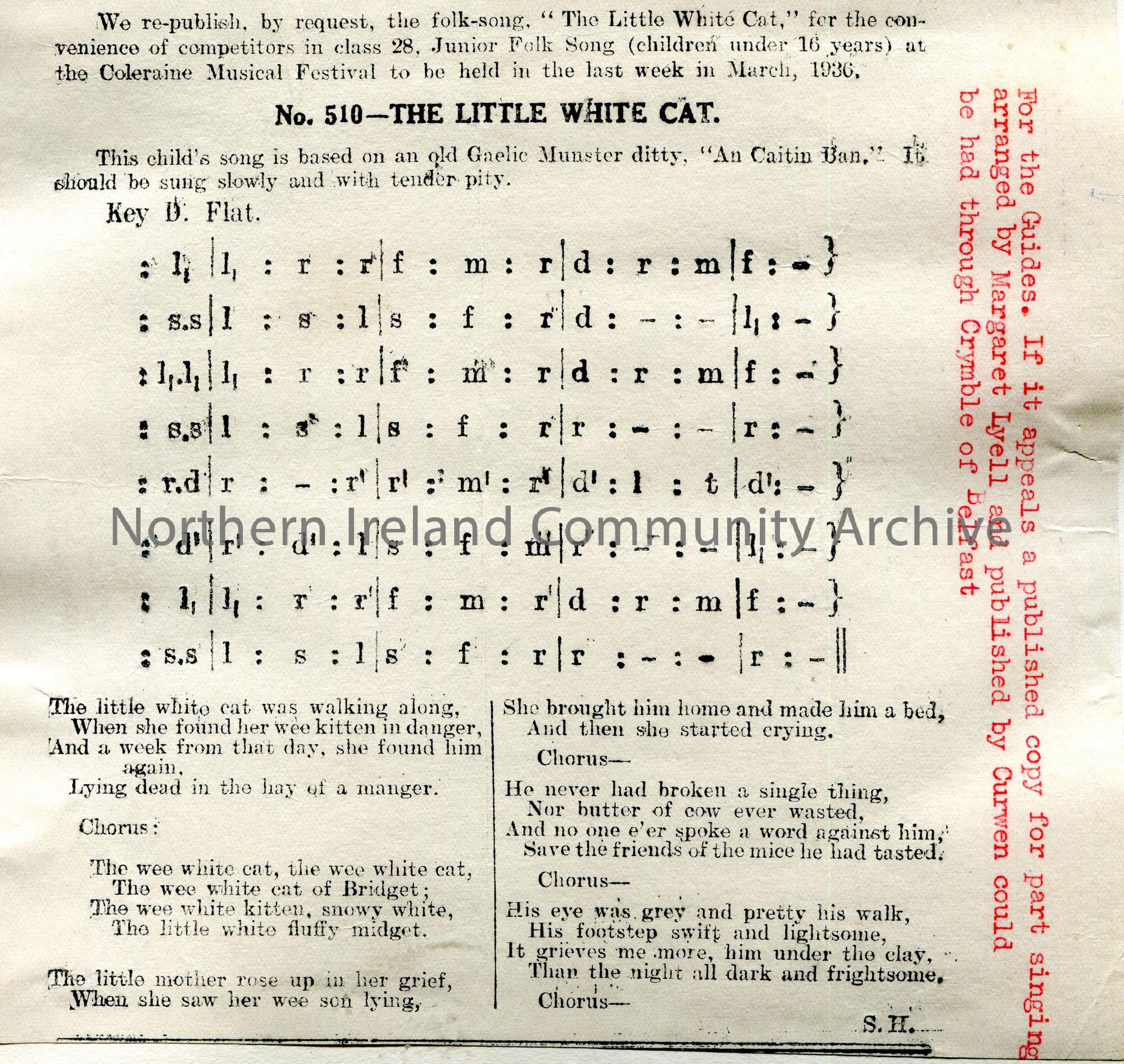 Songs of the People article of tonic sol-fa and words to song titled, ‘No. 510 – The Little White Cat’. A child’s song based on an old Gaelic Munster …