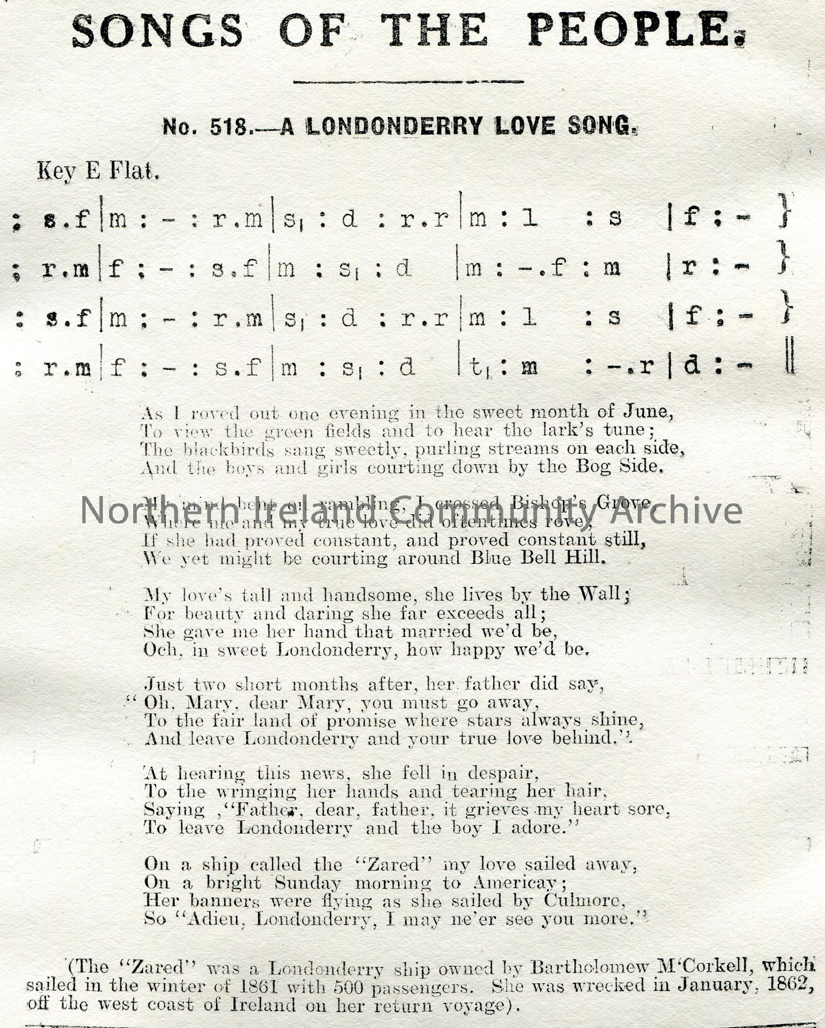 Songs of the People article of tonic sol-fa and words to song titled, ‘No. 518 – A Londonderry Love Song’.