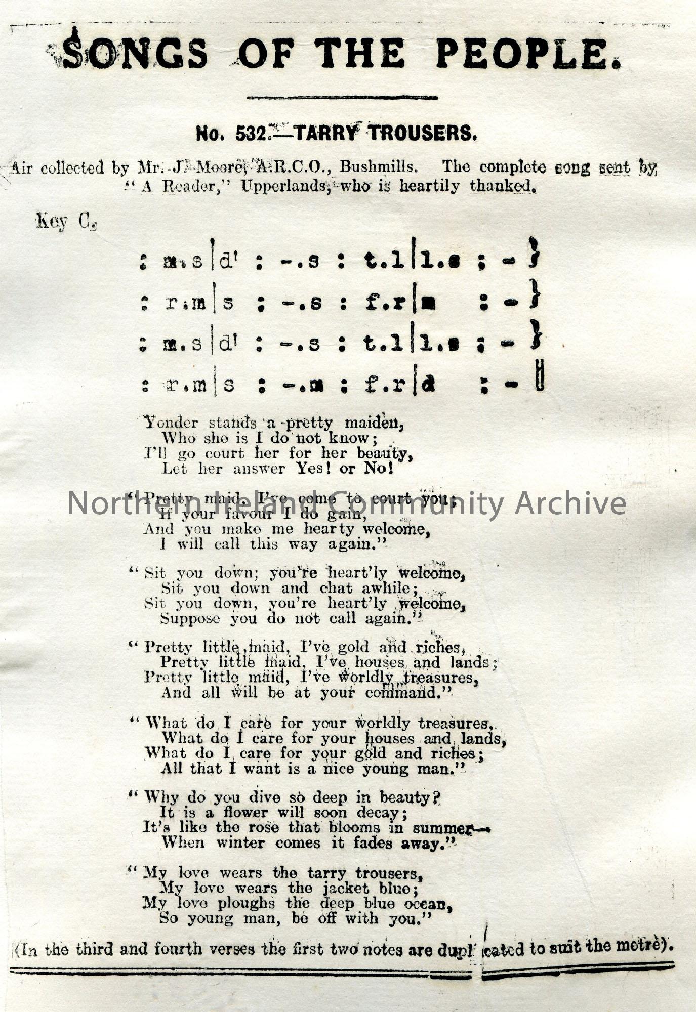 Songs of the People article of tonic sol-fa and words to song titled, ‘No. 532 – Tarry Trousers’. Air collected by Mr J. Moore, A.R.C.O., Bushmills. T…