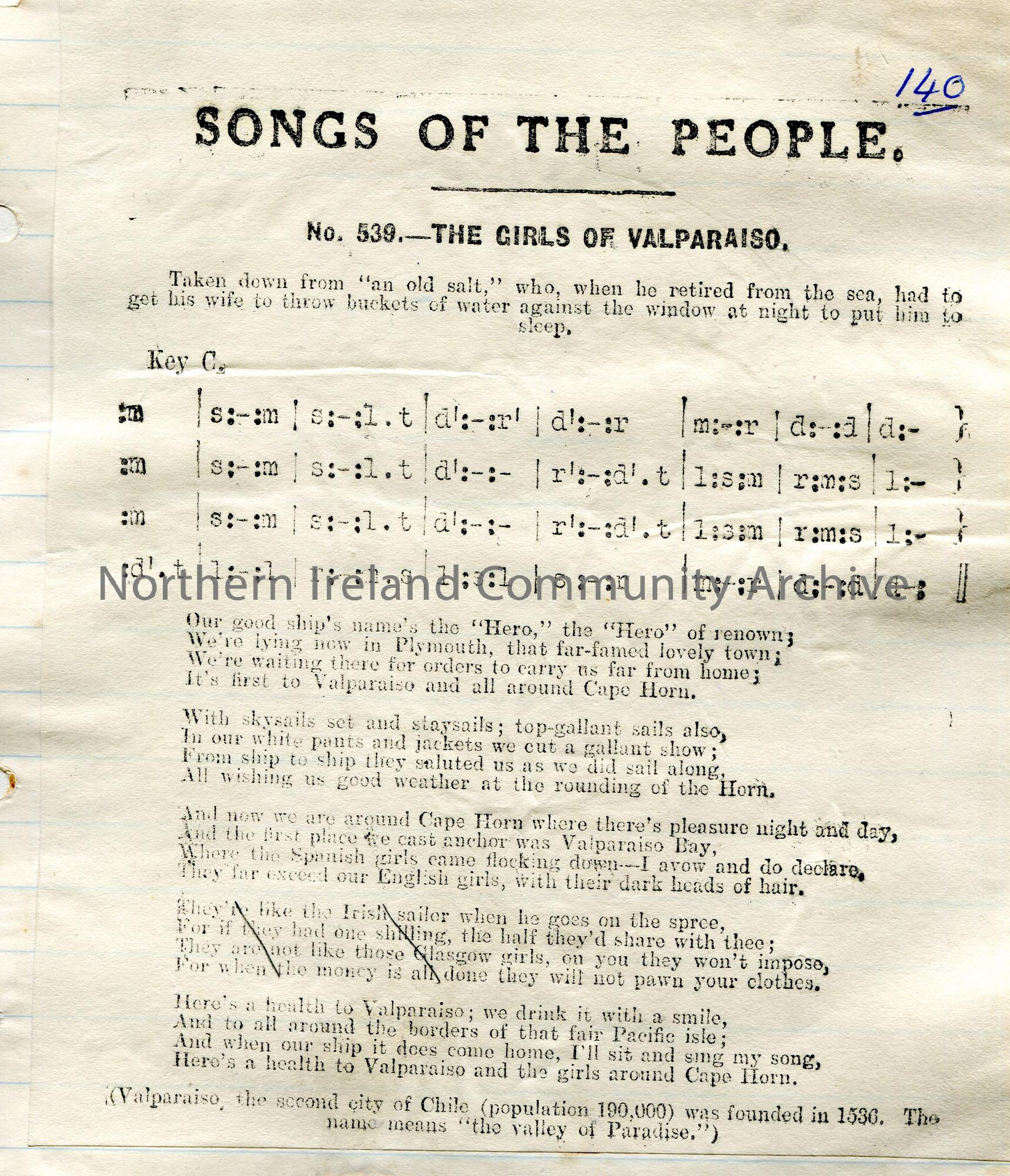 Songs of the People article of tonic sol-fa and words to song titled, ‘No. 539 – The Girls of Valparaiso’. Taken down from “an old salt” who, when he …