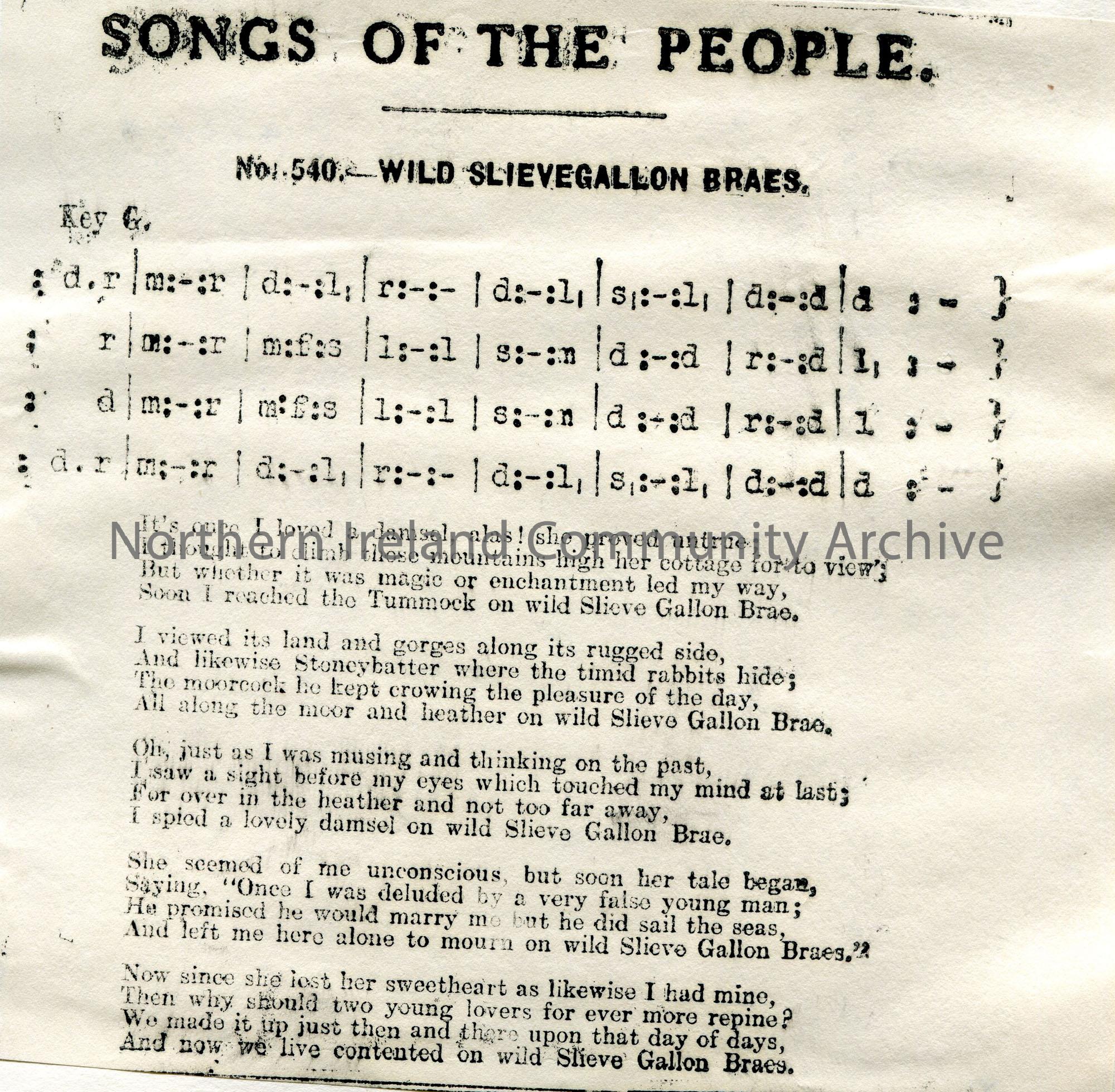Songs of the People article of tonic sol-fa and words to song titled, ‘No. 540 – Wild Slievegallon Braes.’