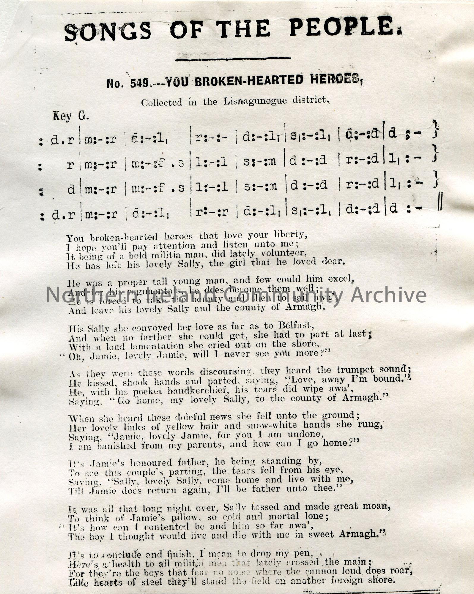 Songs of the People article of tonic sol-fa and words to song titled, ‘No. 549 – You Broken-Hearted Heroes’. Collected in the Lisnagunogue district.