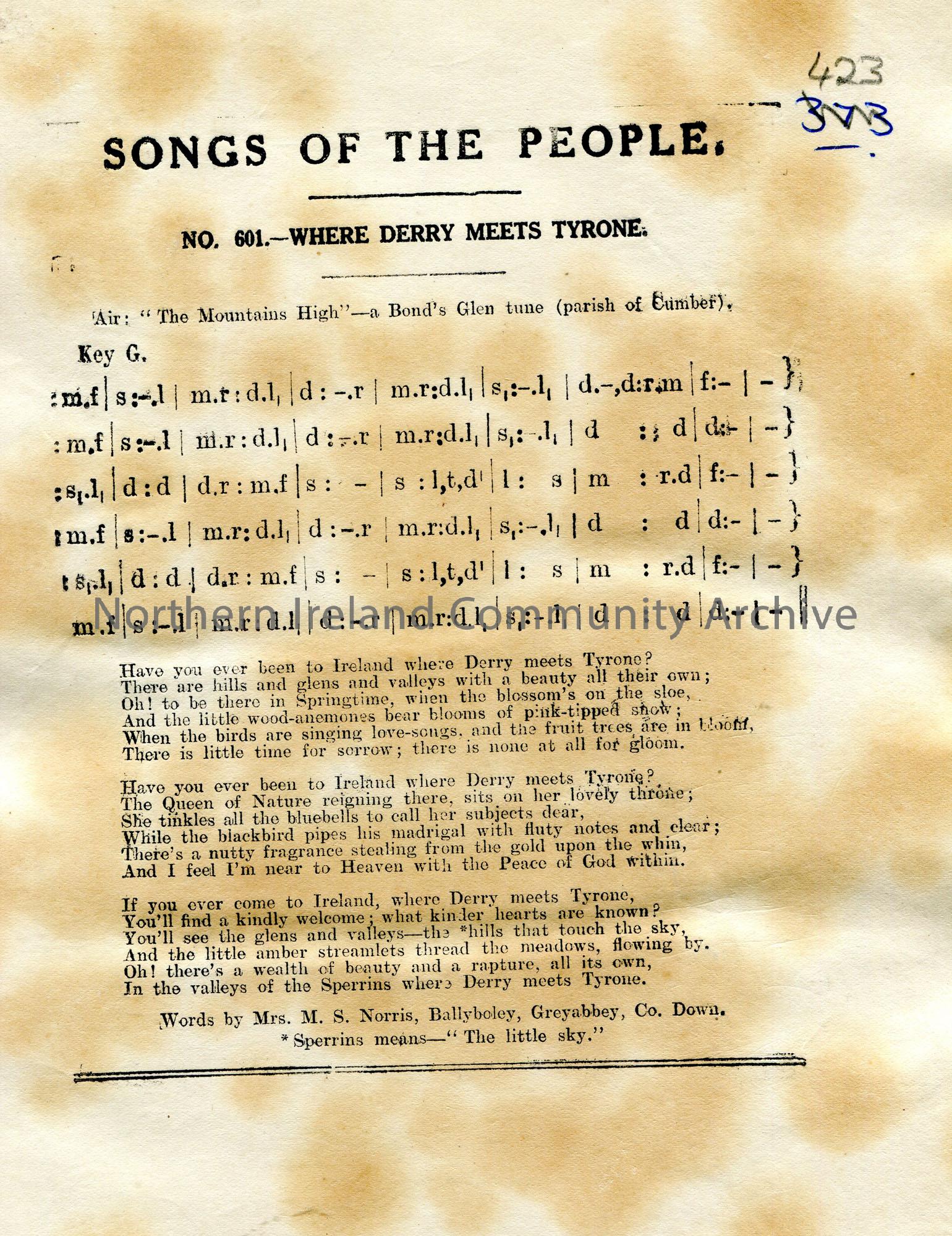 Songs of the People article of tonic sol-fa notation and words to song titled, 'No. 601 - Where Derry Meets Tyrone'. Air - "The Mountains High" - a Bond's Glen tune (parish of Cumber). Words by Mrs M. S. Norris, Ballyboley, Greyabbey, Co. Down.