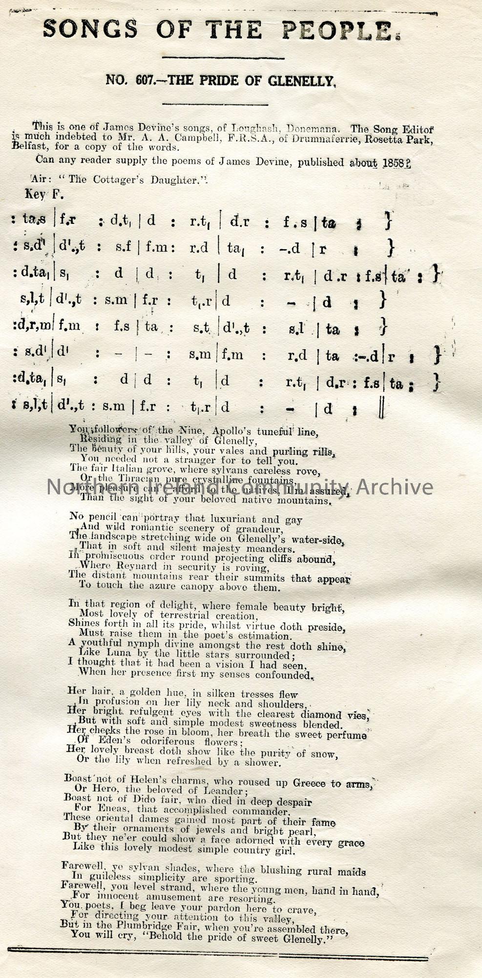 Songs of the People article of tonic sol-fa notation and words to song titled, 'No. 607 - The Pride of Glenelly'. This is one of James Devine's songs, of Loughash, Donemana. The Song Editor is much indebted to Mr A. A. Campbell, F. R. S. A., of Drumnaferrie, Rosetta Park, Belfast, for a copy of the words. Air - "The Cottager's Daughter."