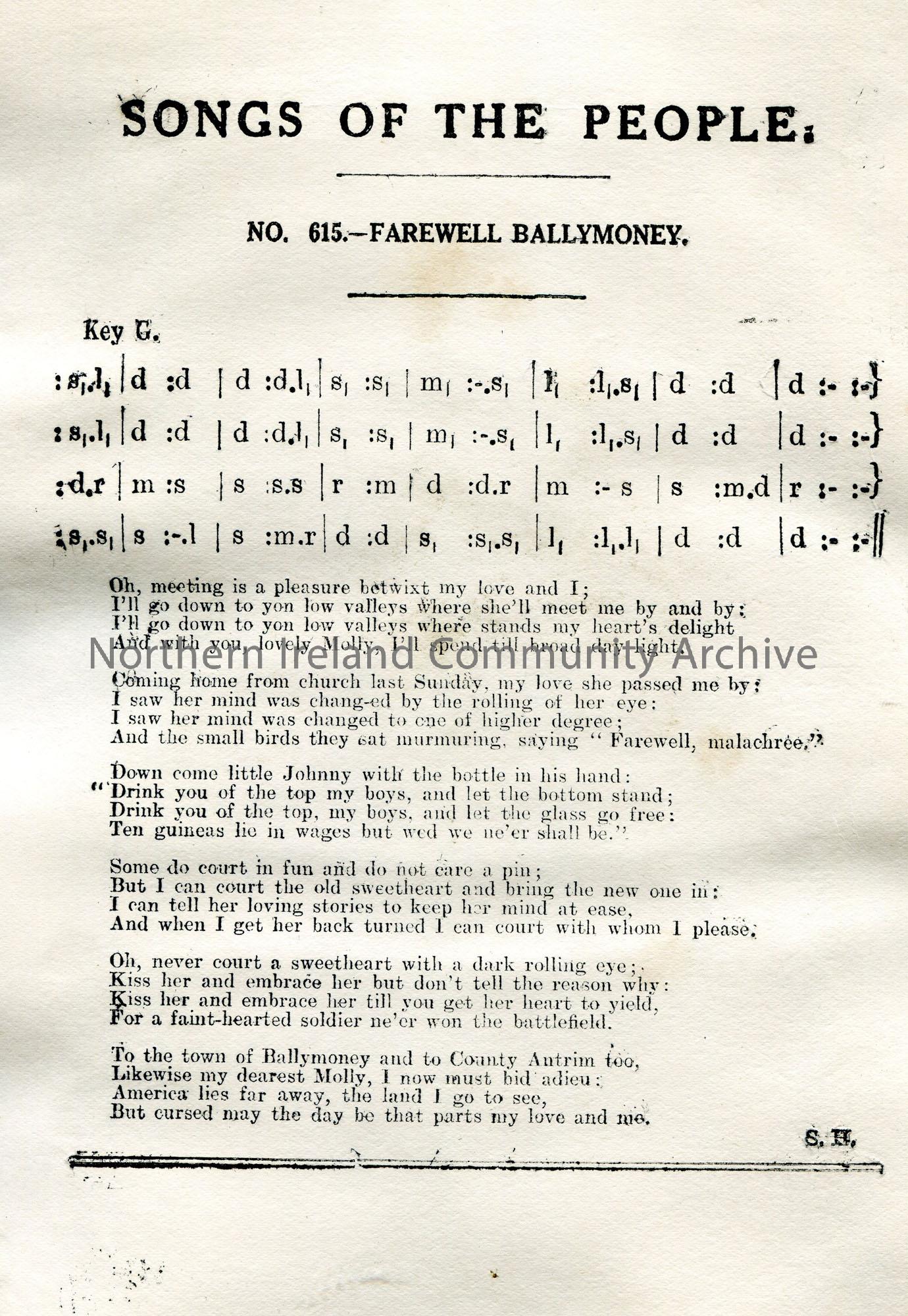 Songs of the People article of tonic sol-fa notation and words to song titled, ‘No. 615 – Farewell Ballymoney’.