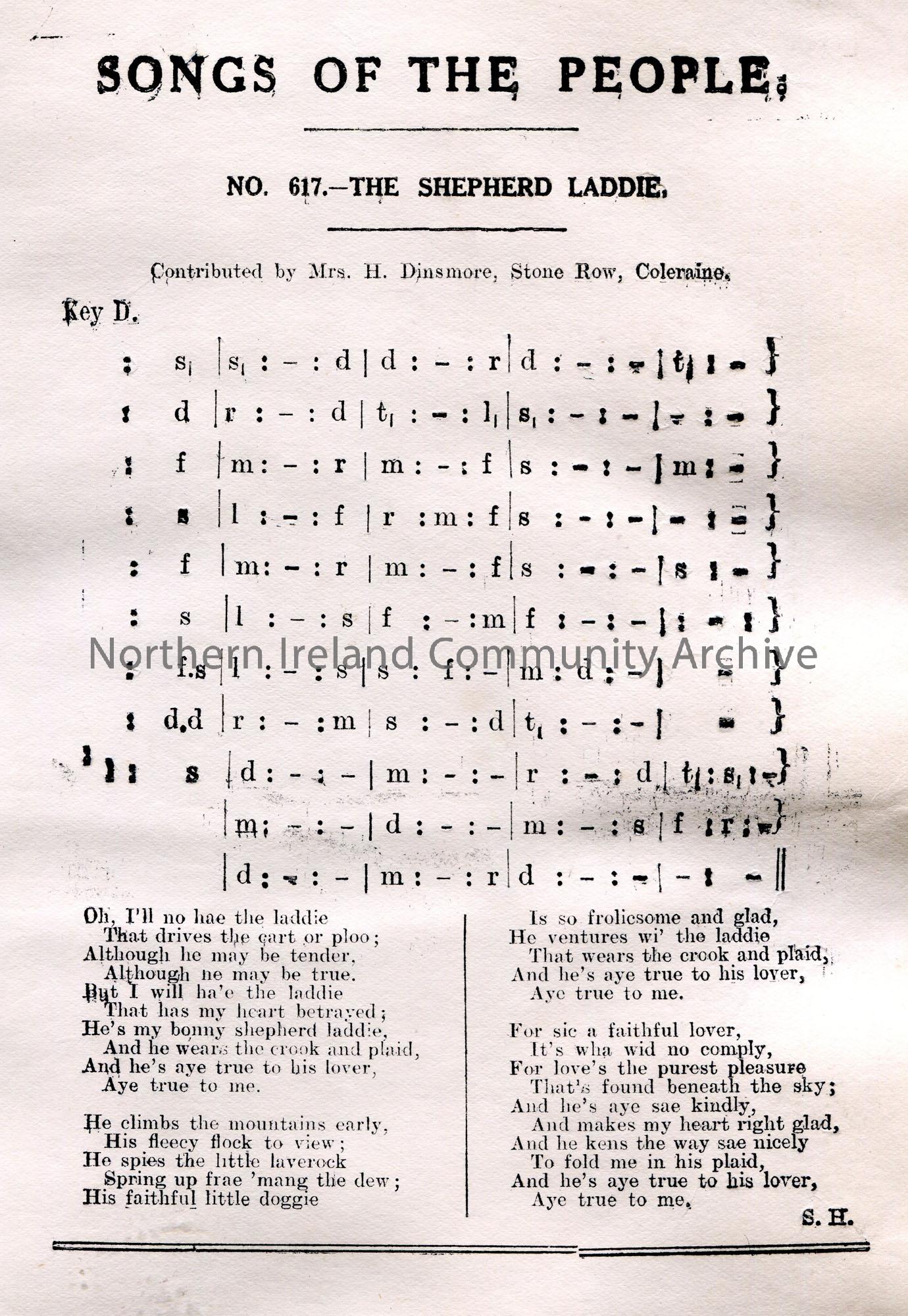 Songs of the People article of tonic sol-fa notation and words to song titled, 'No. 617 - The Shepherd Laddie'. Contributed by Mrs H. Dinsmore, Stone Row, Coleraine.