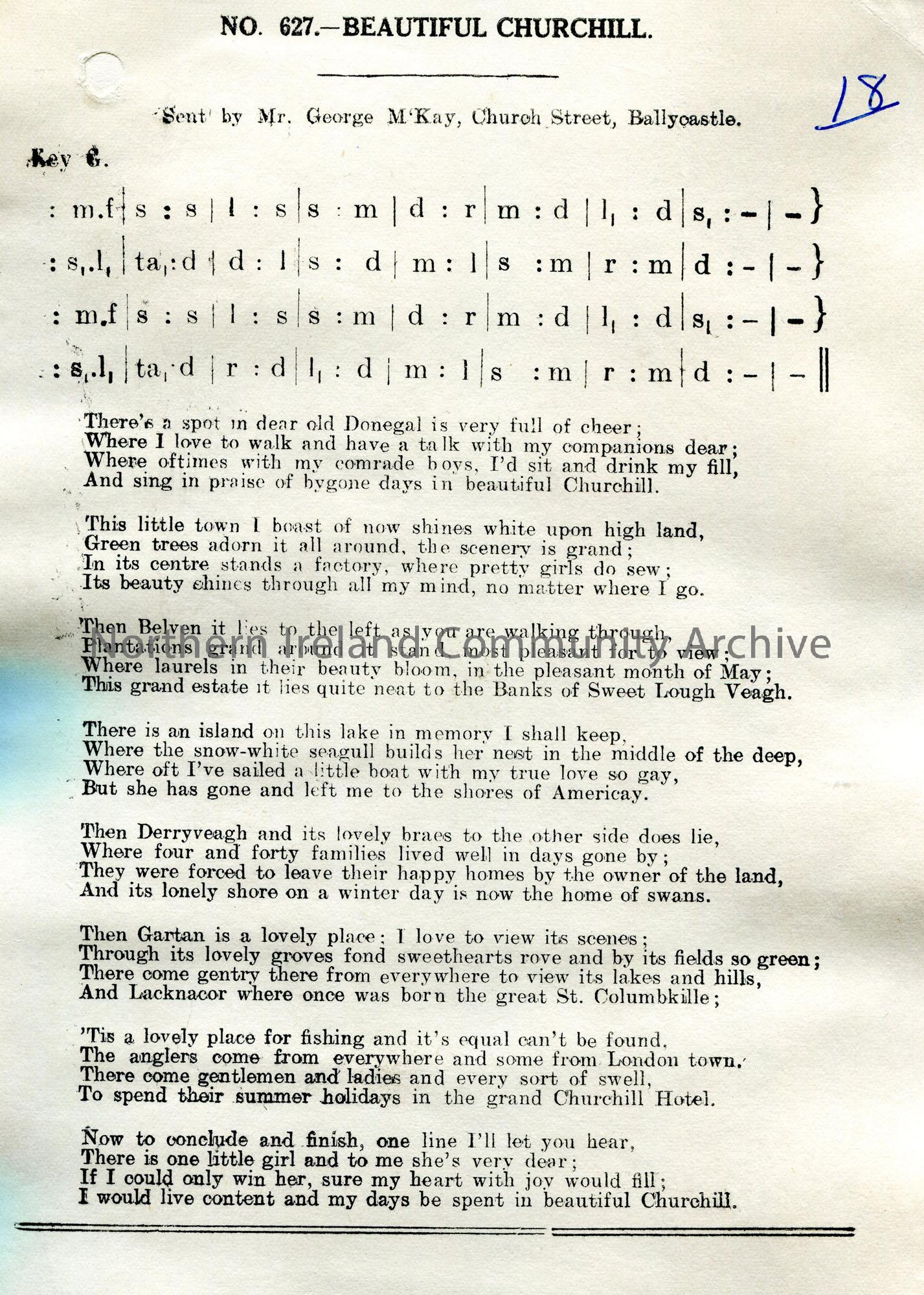 Songs of the People article of tonic sol-fa notation and words to song titled, 'No. 627 - Beautiful Churchill'. Sent by Mr George McKay, Church Street, Ballycastle.