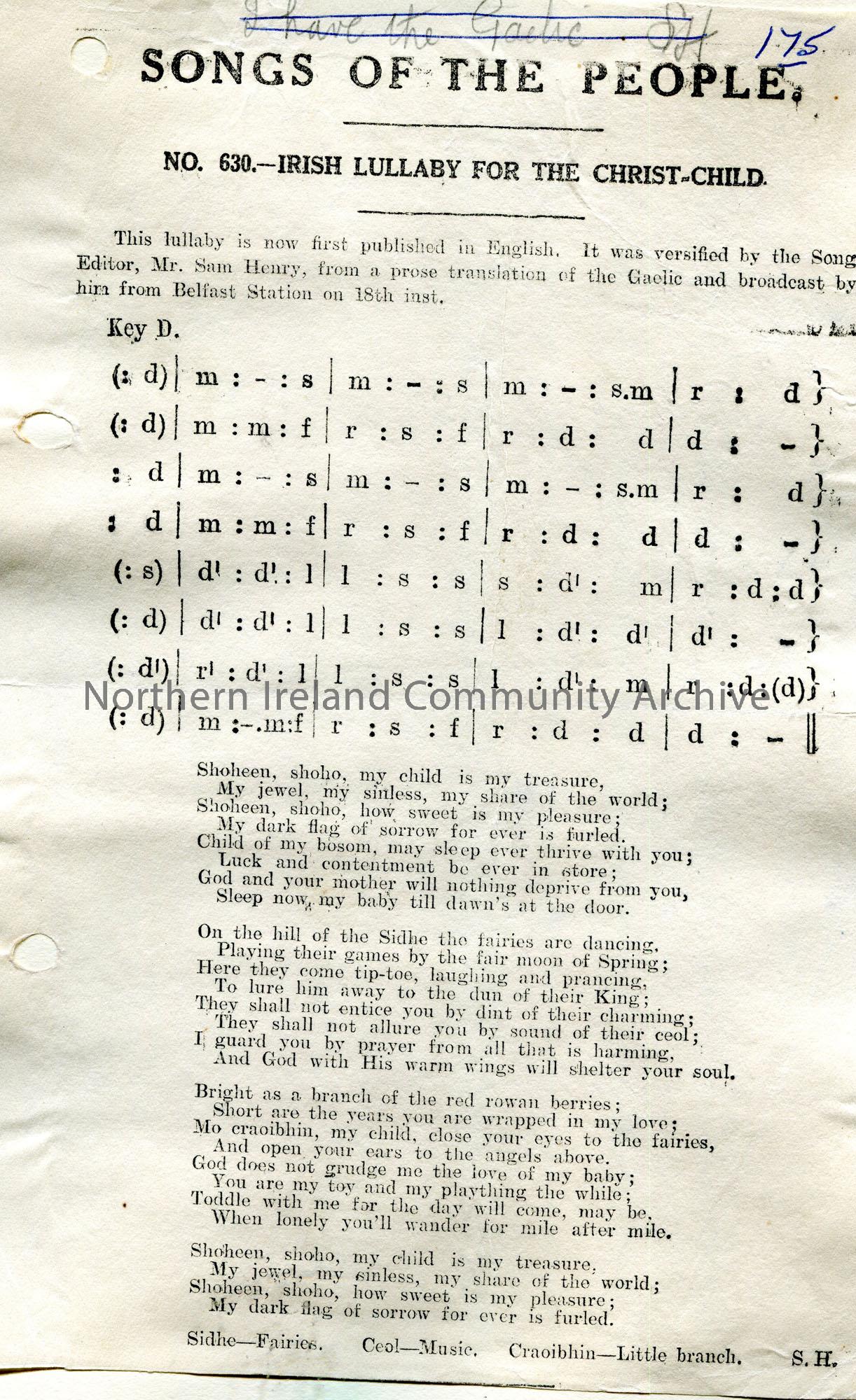 Songs of the People article of tonic sol-fa notation and words to song titled, 'No. 630 - Irish Lullaby for the Christ-Child'. Versified by Sam Henry from a prose translation of the Gaelic and broadcast by him from Belfast Station on 18th ? 'I have the Gaelic. SH' handwritten at top of page which is scored out.