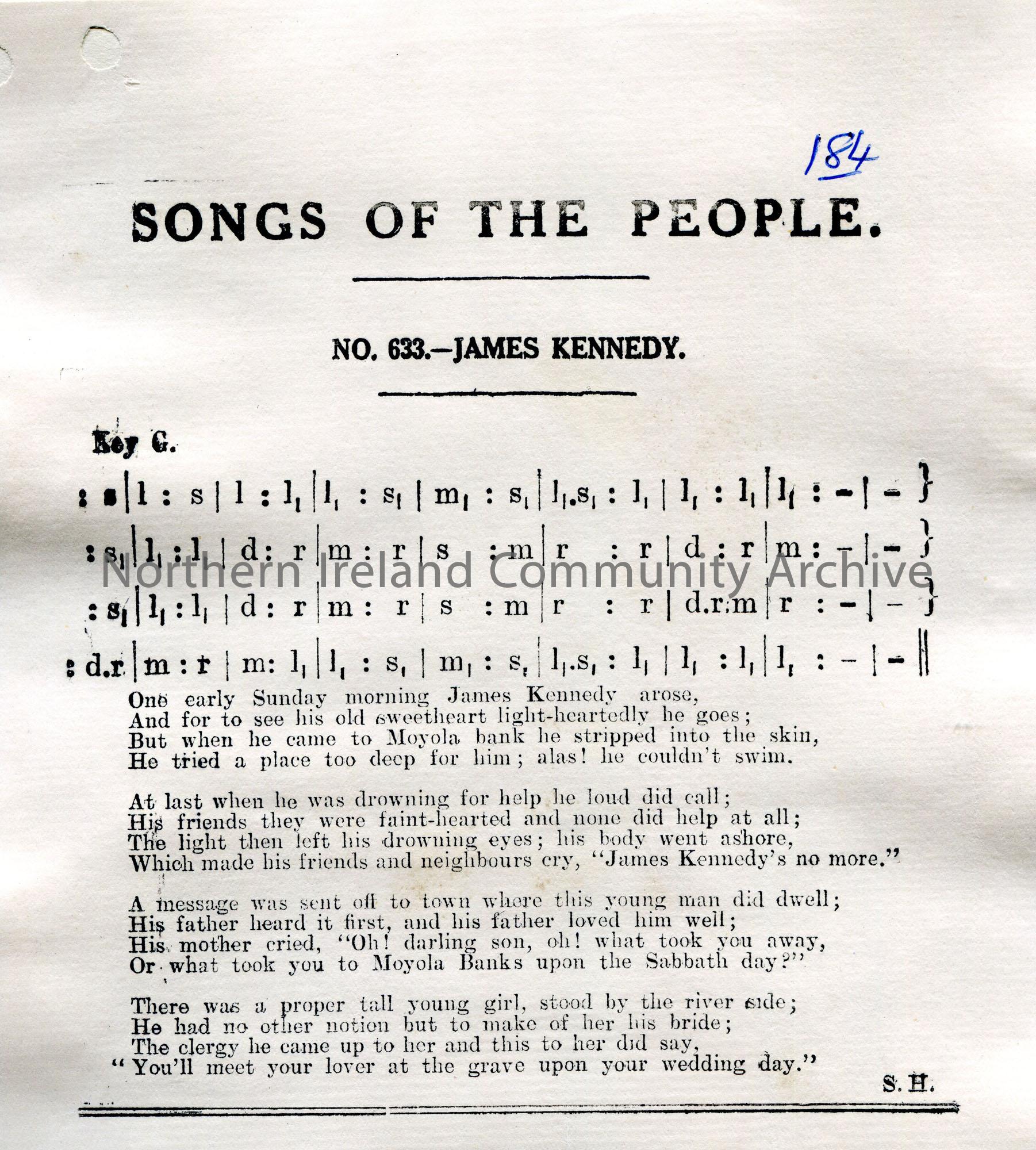 Songs of the People article of tonic sol-fa notation and words to song titled, ‘No. 633 – James Kennedy’.