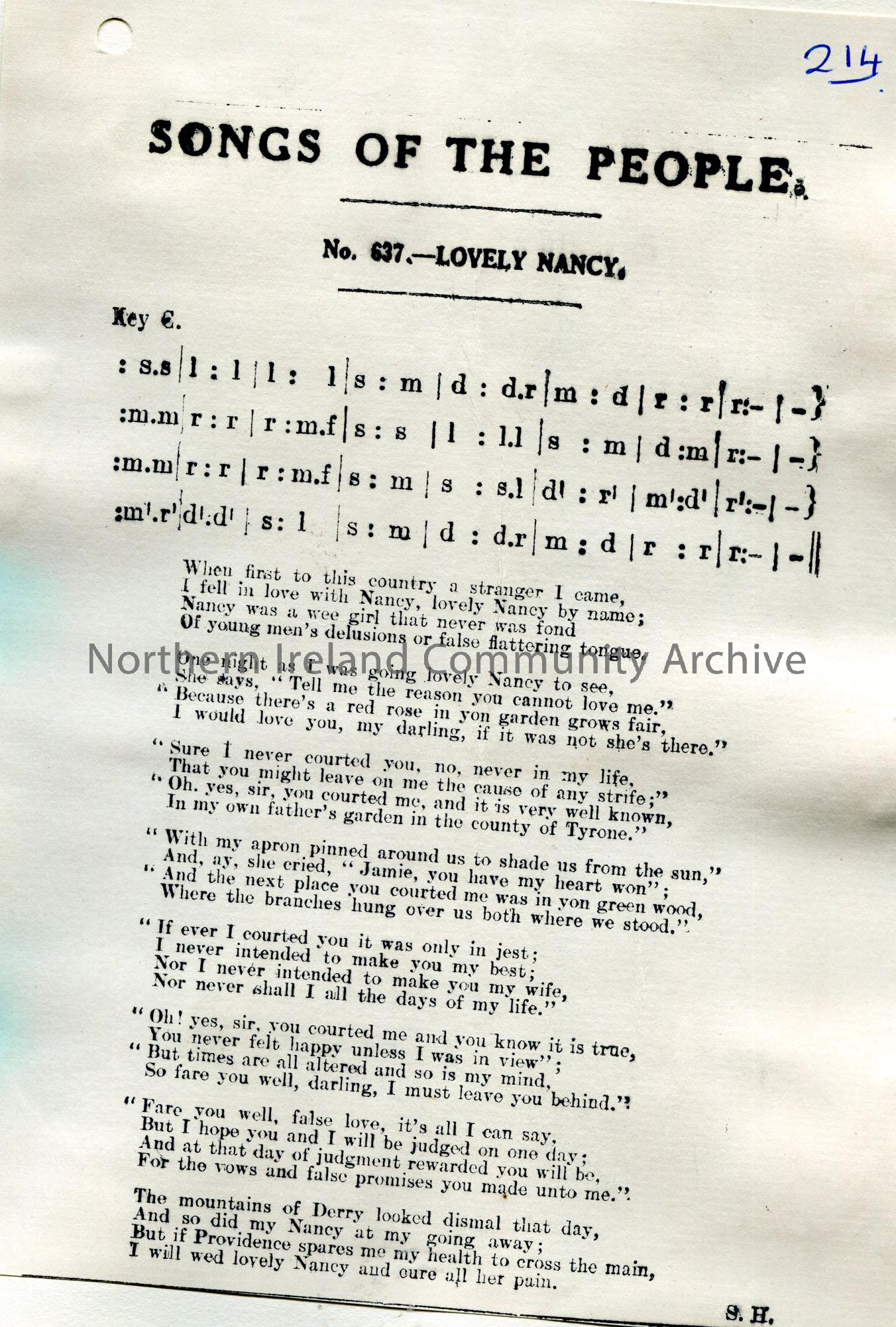 Songs of the People article of tonic sol-fa notation and words to song titled, ‘No. 637 – Lovely Nancy’.