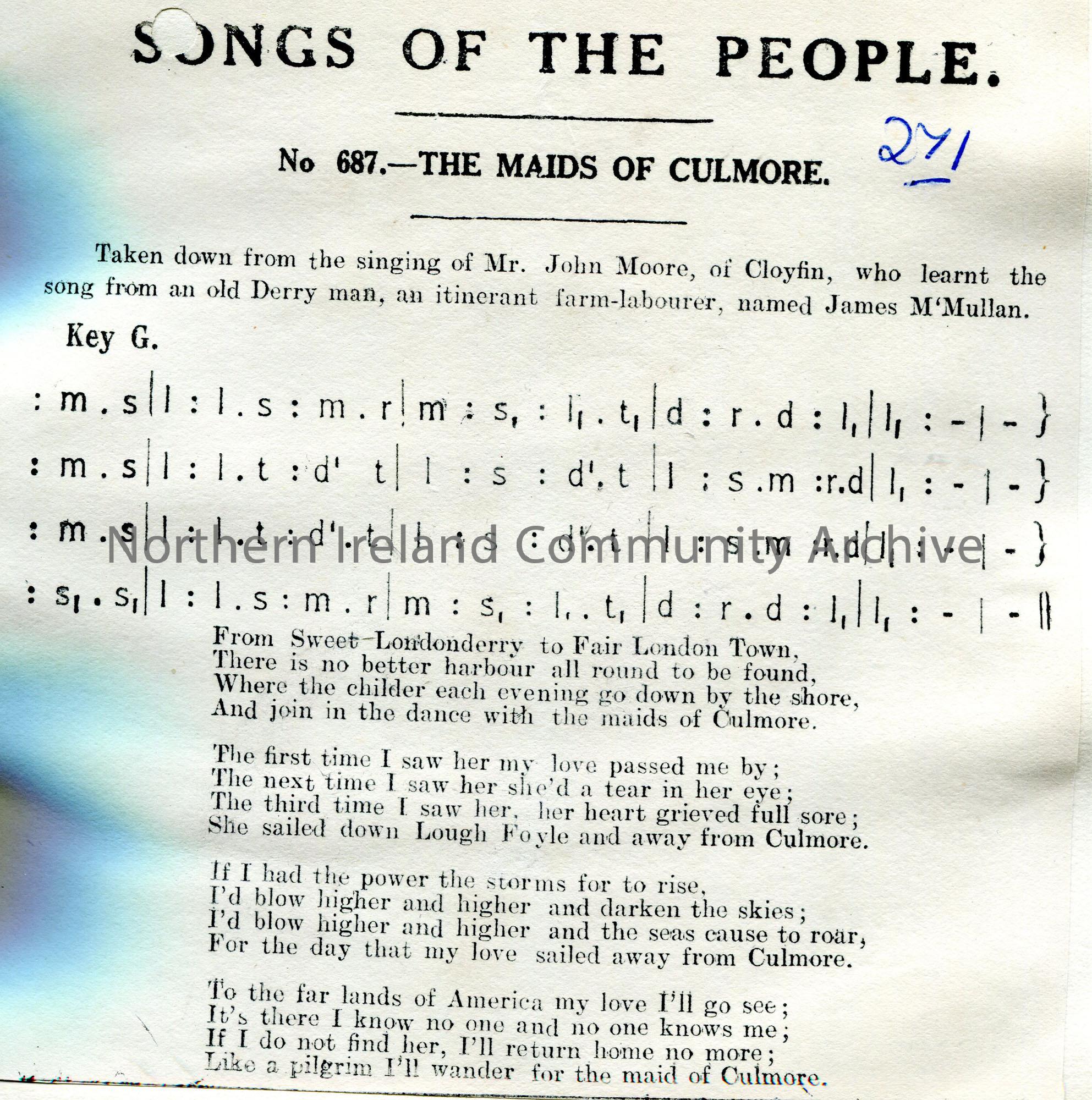 Songs of the People article of tonic sol-fa notation and words to song titled, 'No. 687 - The Maids of Culmore'. Taken down from the singing of Mr John Moore, Cloyfin, who learnt the song from an old Derry man, an itinerant farm-labourer, named James McMullan.