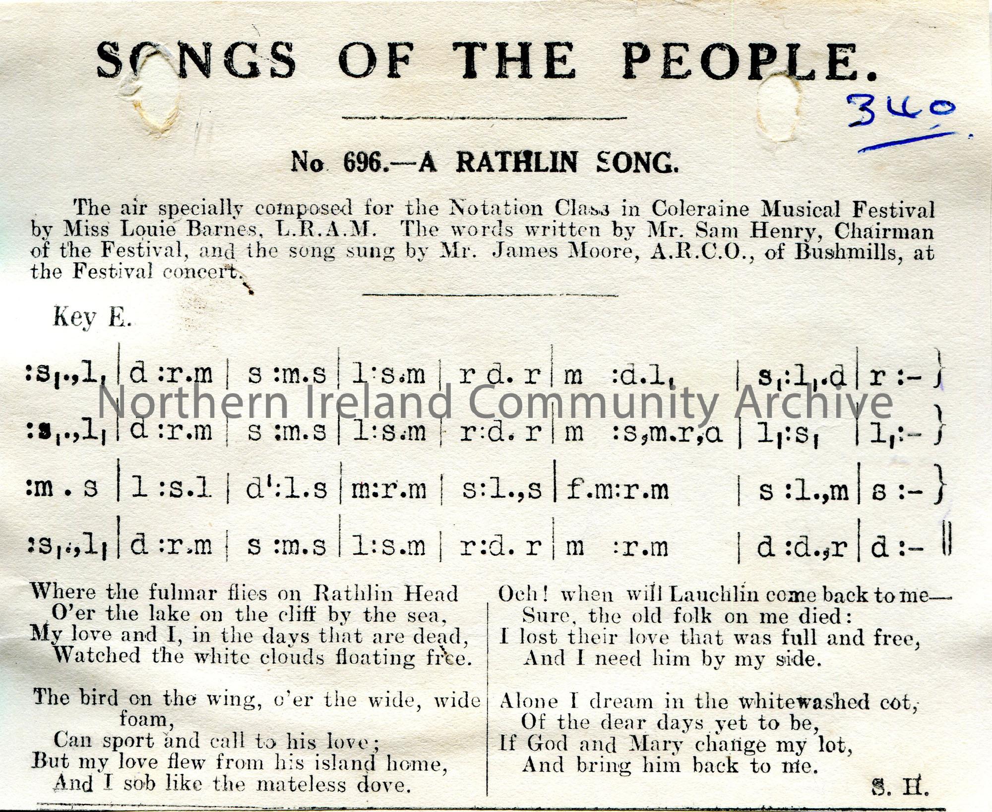 Songs of the People article of tonic sol-fa notation and words to song titled, 'No. 696 - A Rathlin Song'. The air specially composed for the Notation Class in Coleraine Music Festival by Miss Louie Barnes, L.R.A.M. The words written by Mr Sam Henry, Chairman of the Festival, and the song sung by Mr James Moore, A.R.C.O., of Bushmills, at the Festival concert.