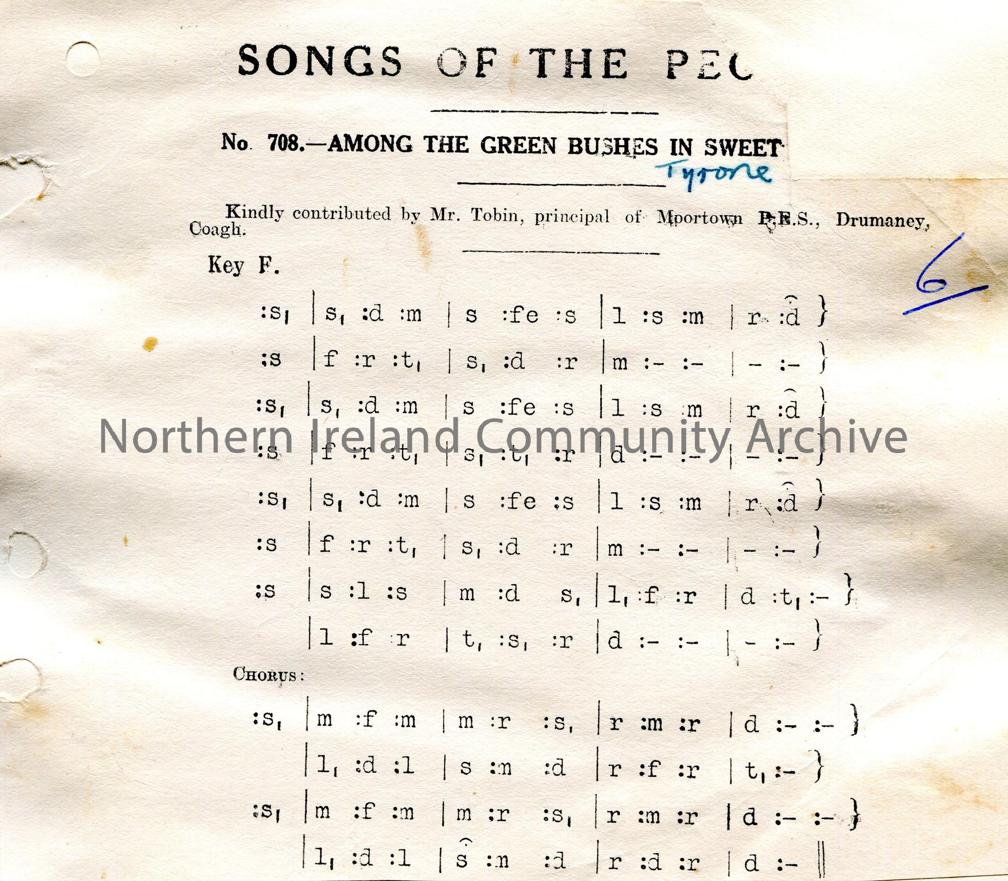 Songs of the People article of tonic sol-fa notation to song titled, 'No. 708 - Among the Green Bushes in Sweet Tyrone'. Contributed by Mr Tobin of Moortown P.E.S., Drumaney, Coagh. [The words to the song are missing].