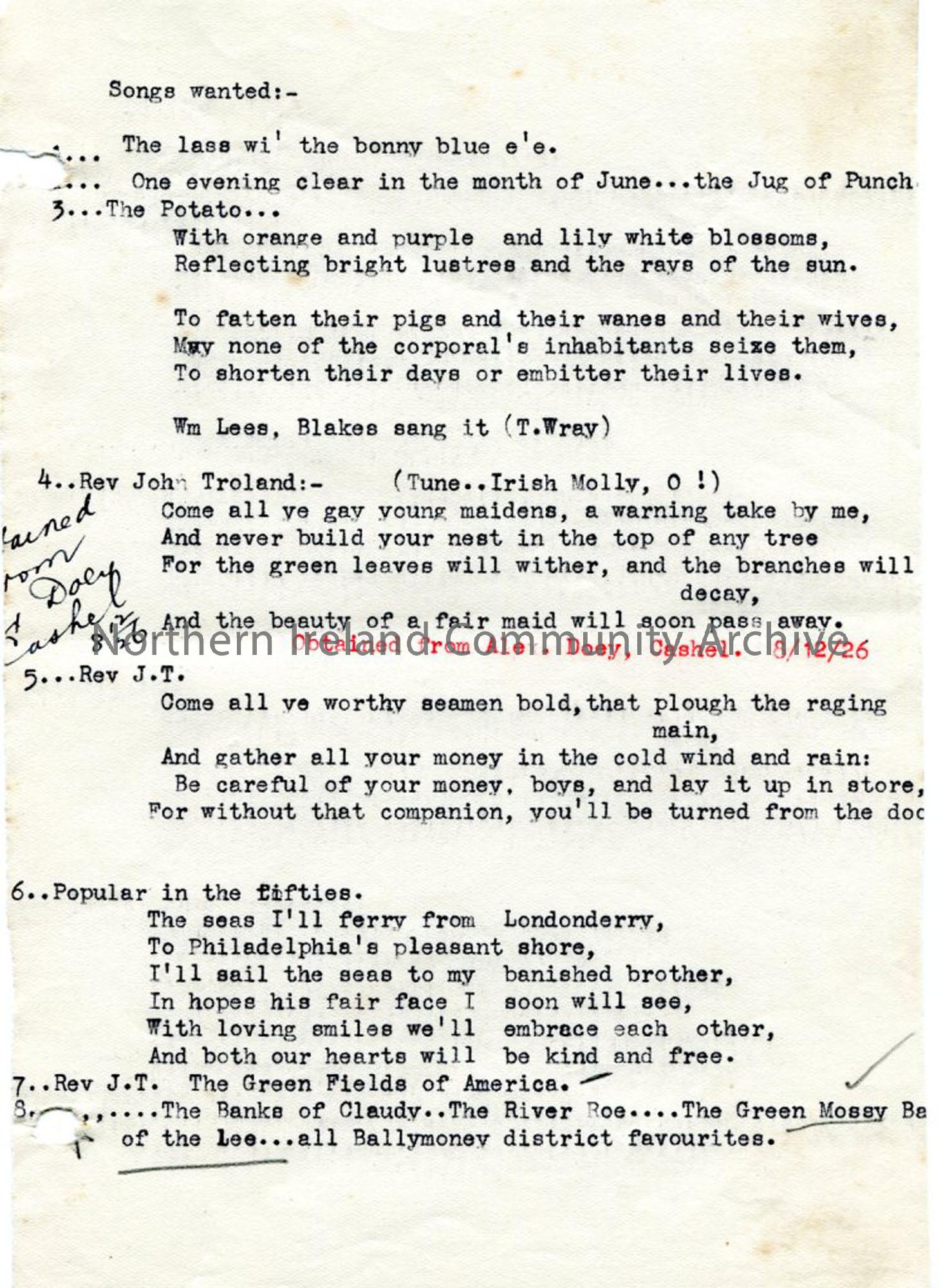 Typed page with 'Songs Wanted' - several names entered and 'obtained' in red, with name of donor.