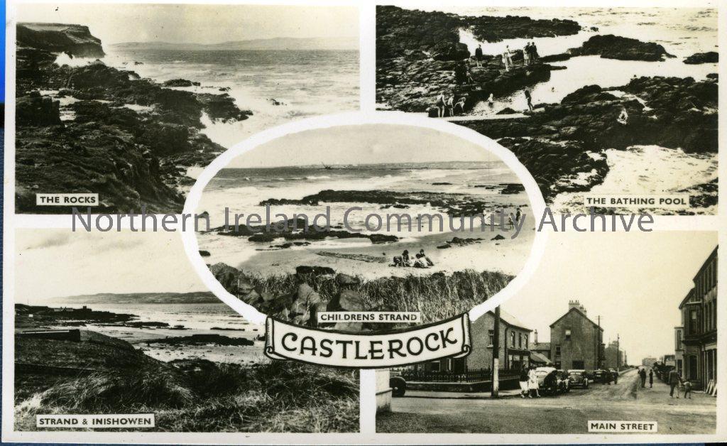 Black and white souvenir postcard of Castlerock, circa early 20th century. Features images of The Rocks, strand & Inishowen, Childrens Strand, The Bathing Pool and the Main Street. Real Photo Productions