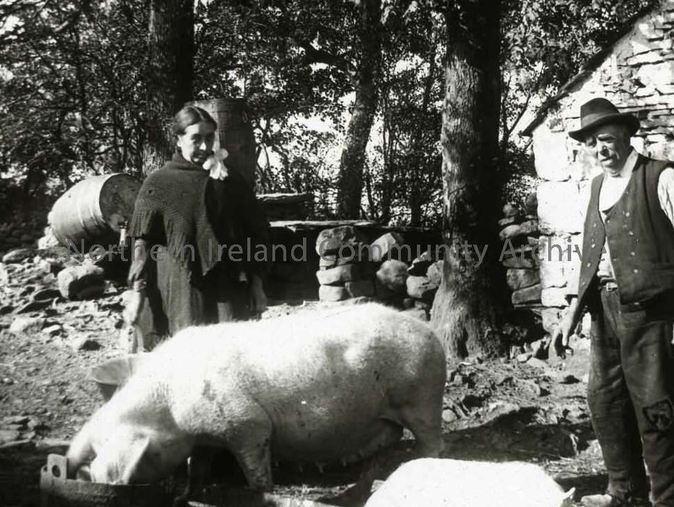 Man and woman in farmyard with sow - The McKanes. (JM - the famous farrowing sow 'Noon' - 1906)