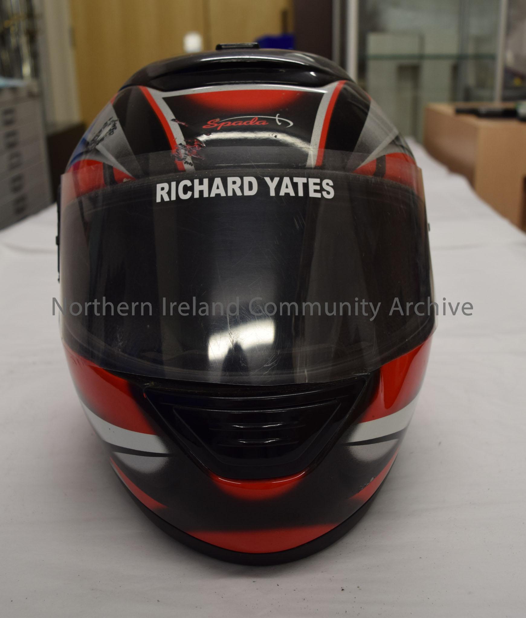 Spada motorcycle helmet belonging to Richard Yates. Black helmet with red and silver pattern
