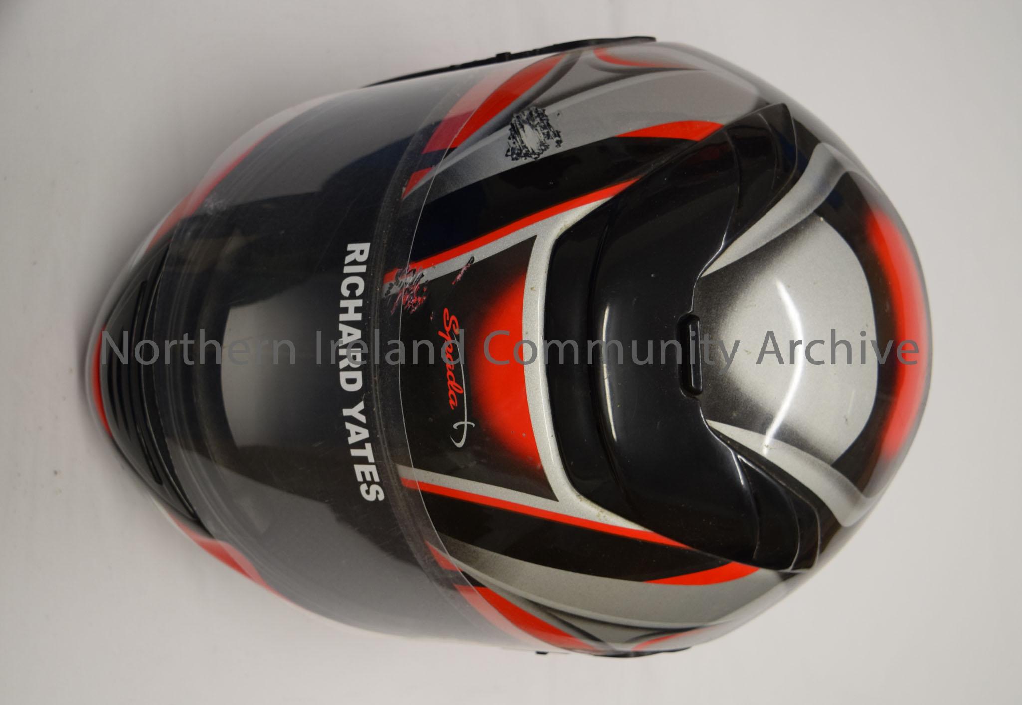 Spada motorcycle helmet belonging to Richard Yates. Black helmet with red and silver pattern