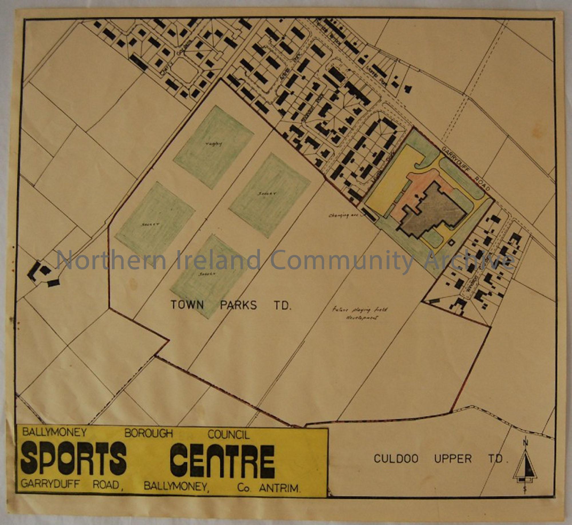 Sports Centre Plan. Shows position of proposed Sports Centre and pitches, with these areas coloured in pencil, plan has a plastic yellow label. Situated in the Townland of Culdoo Upper