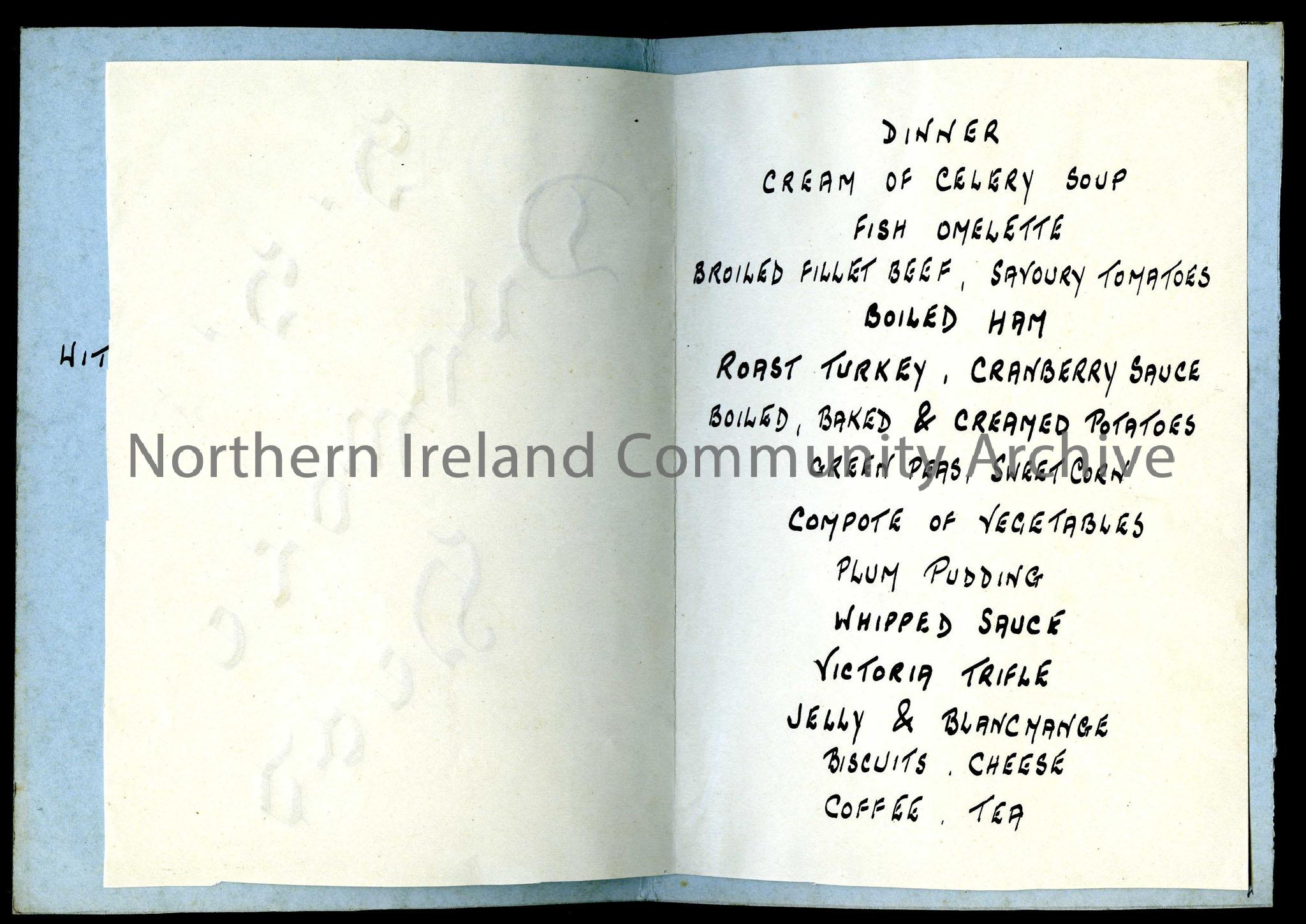 S.S Dumore Head 1936 Xmas menu, With Compliments of the Head Line, drawing of a ship on front