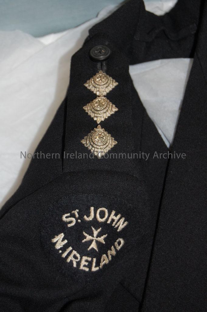 St. John Ambulance uniform. Jacket and skirt (black) and belt with 3 stars on epaulettes – 2010.588 (2)