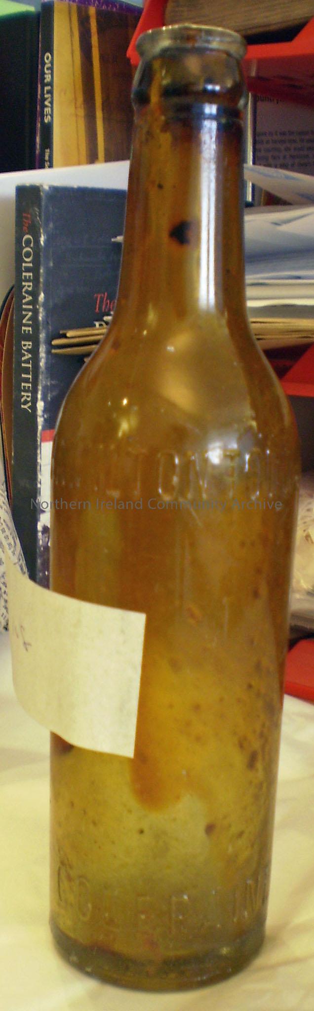 Stained glass bottle. Imprinted on the glass is ‘Hamilton Todd & Co., Coleraine’. Imprinted on the base reads – ‘British made M653’.