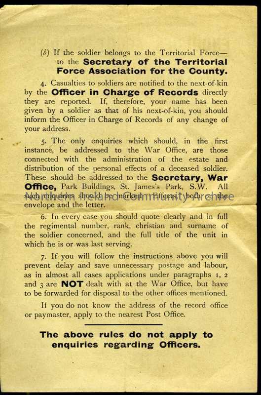 Standard printed leaflet under heading 'Enquiries About Soldiers' - giving instruction for various scenarios