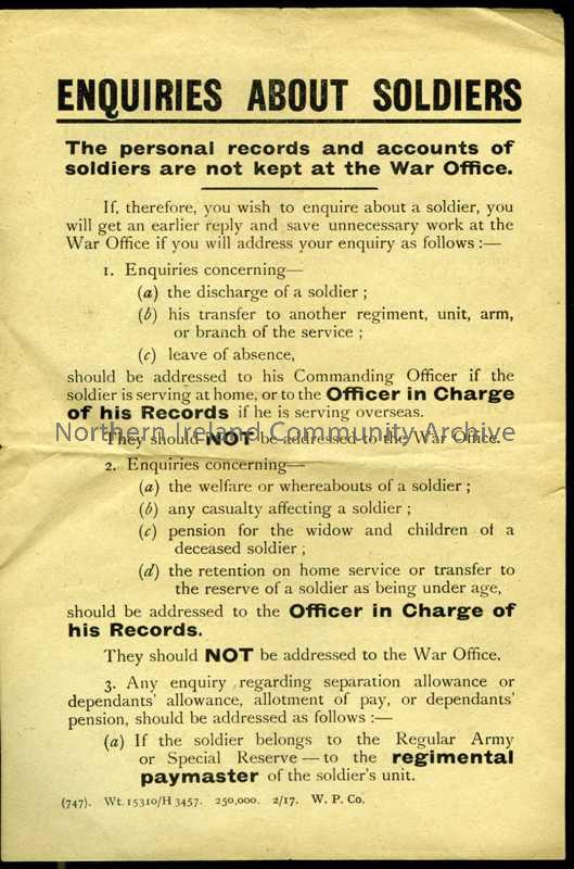 Standard printed leaflet under heading ‘Enquiries About Soldiers’ – giving instruction for various scenarios