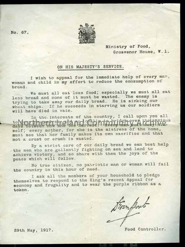 Standard printed letter re reduction of bread consumption – part of King’s Appeal for economy and frugality – invited to wear purple ribbon as token