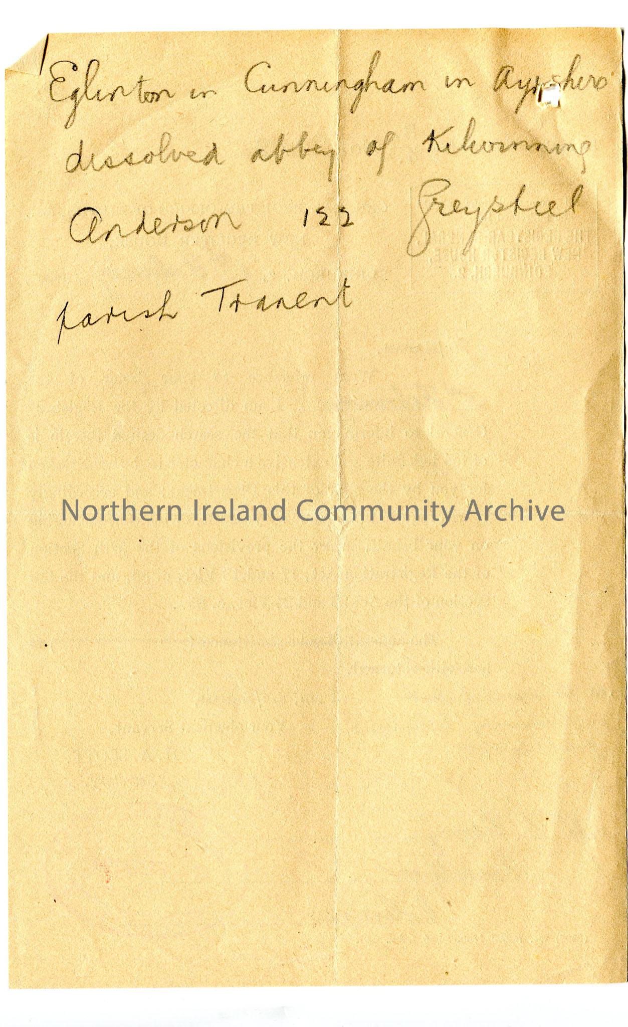 Standard reply slip from The Registrar General for Scotland - re deaths in Kilwinning. Handwritten notes on back re Eglintons and Kilwinning