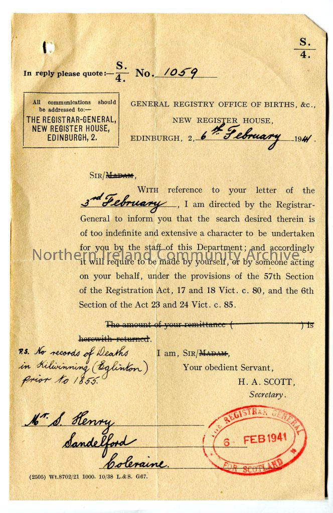 Standard reply slip from The Registrar General for Scotland – re deaths in Kilwinning. Handwritten notes on back re Eglintons and Kilwinning
