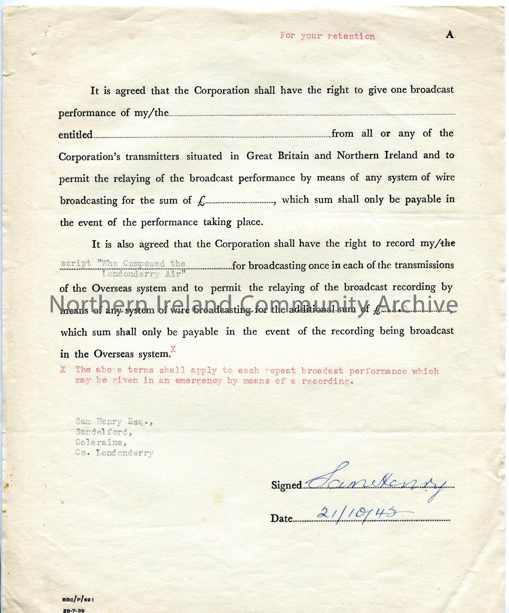 Standard typed permission slip for use of material broadcast, with Sam Henry’s particular’s and signature