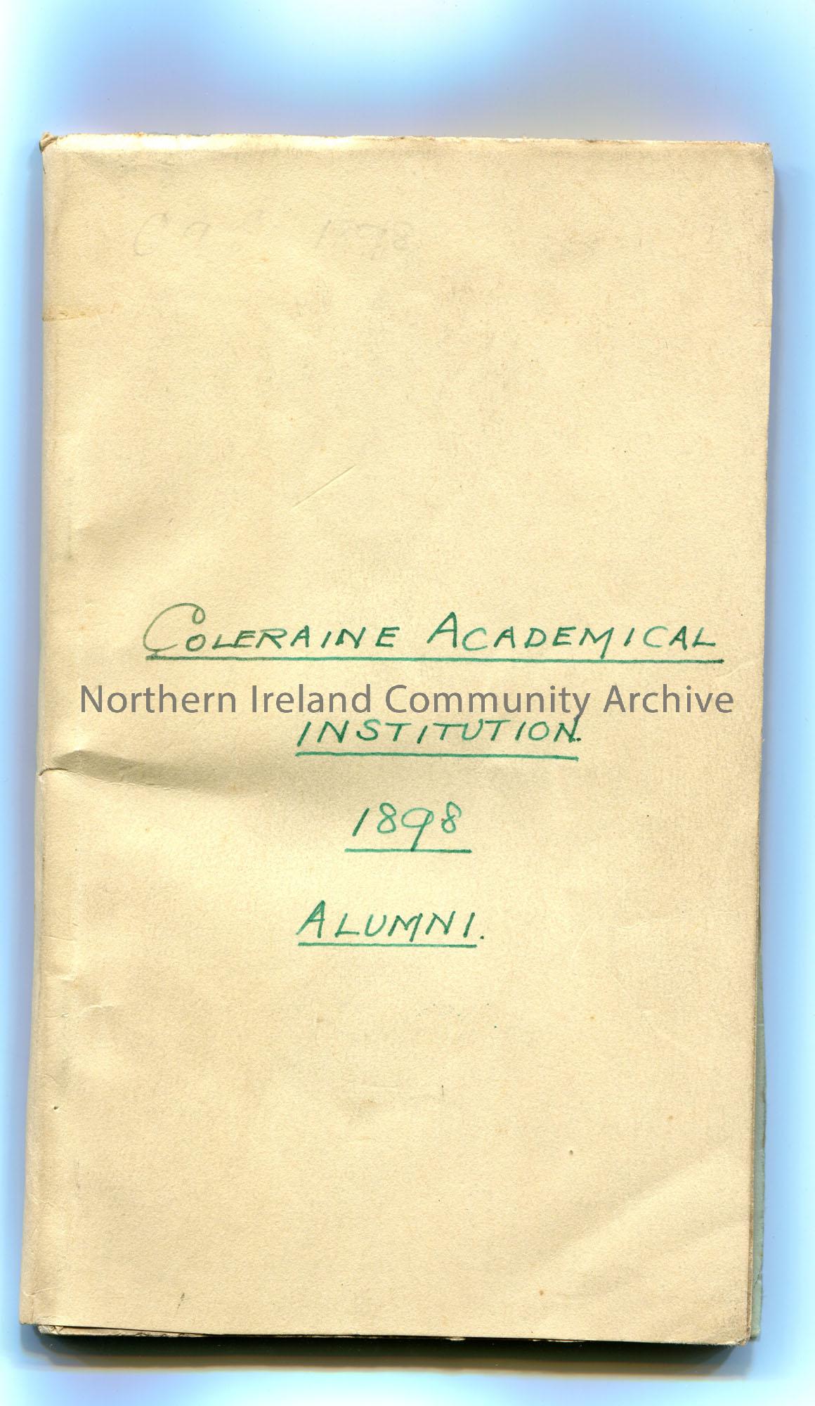 Stapled booklet. Handwritten cover [appears to have been added at a later stage] on front ‘Coleraine Academical Institution 1898 Alumni’. Coleraine Ac…