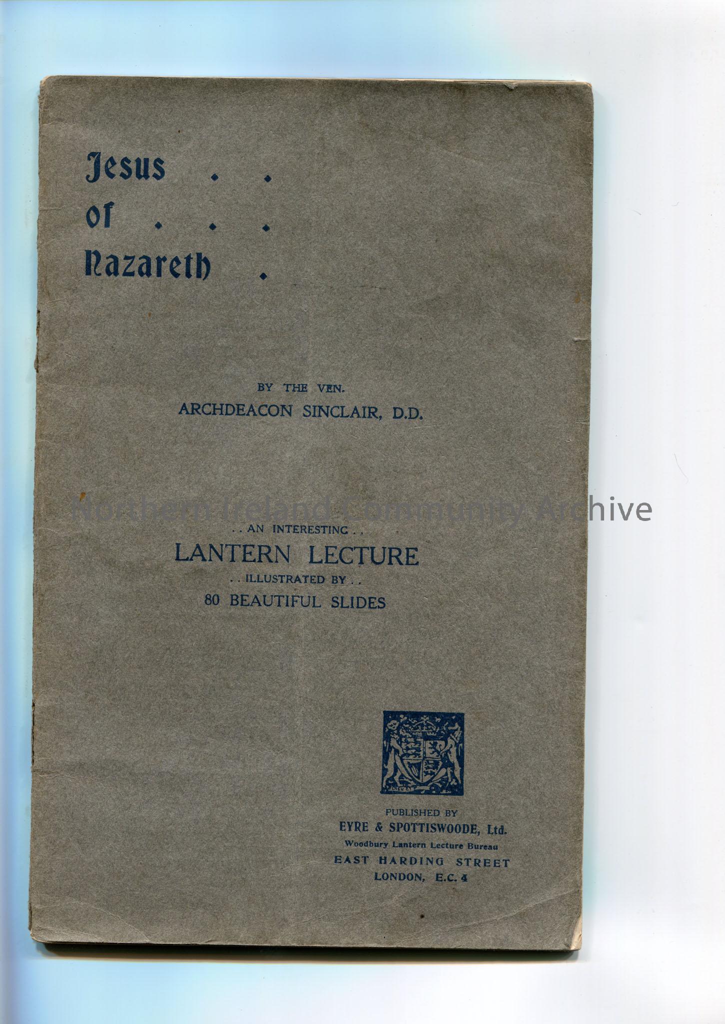 Stapled booklet titled, ‘Jesus of Nazareth’ by the Ven. Archdeacon Sinclair, D.D. ‘An Interesting Lantern Lecture Illustrated By 80 Beautiful Slides’….