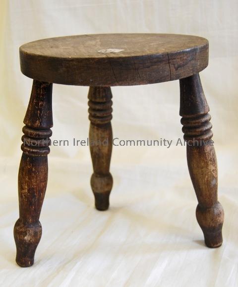 Creepy stool (very low stool)- wood with turned legs. Courtesy of Ballycastle Museum.